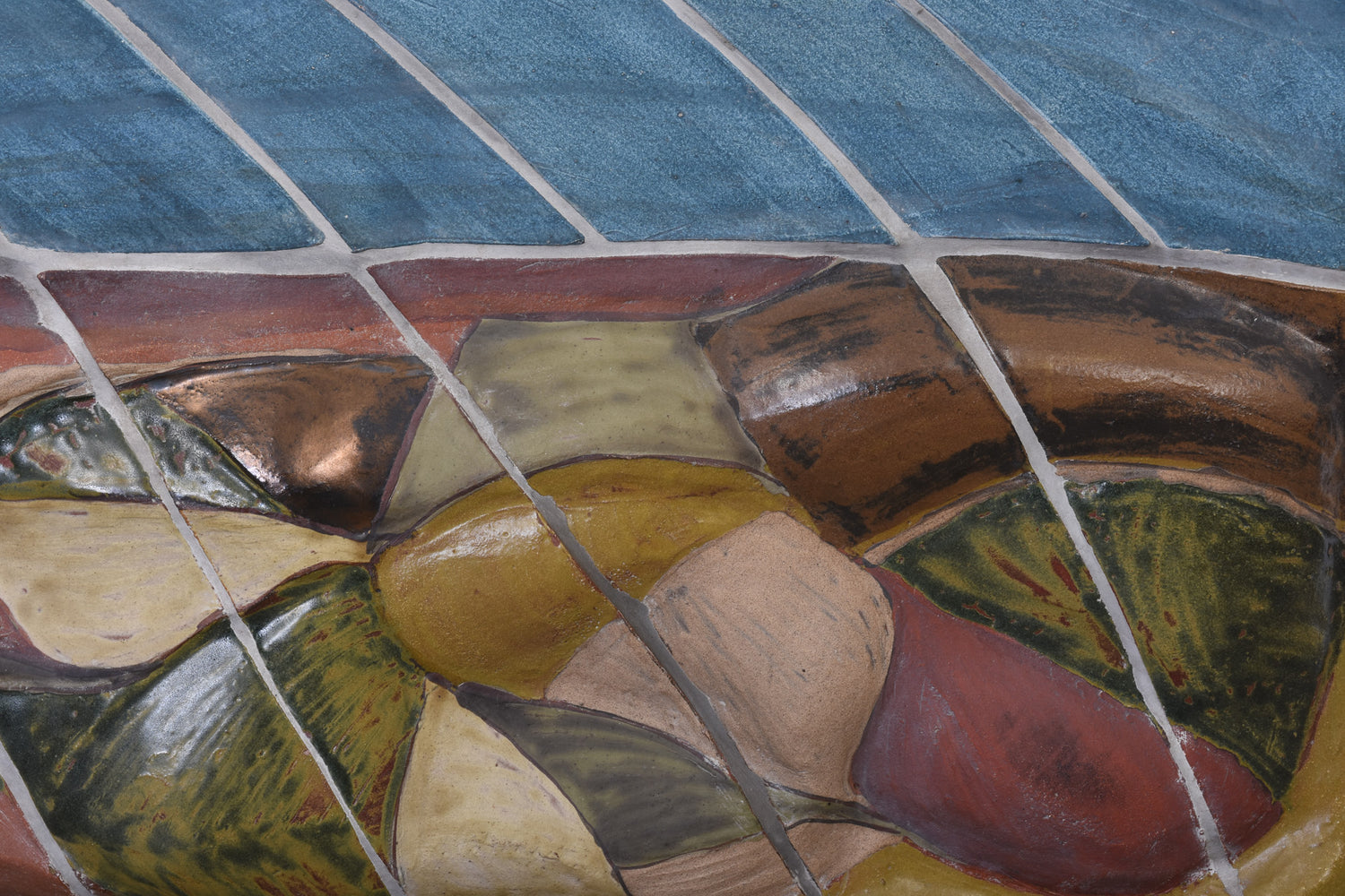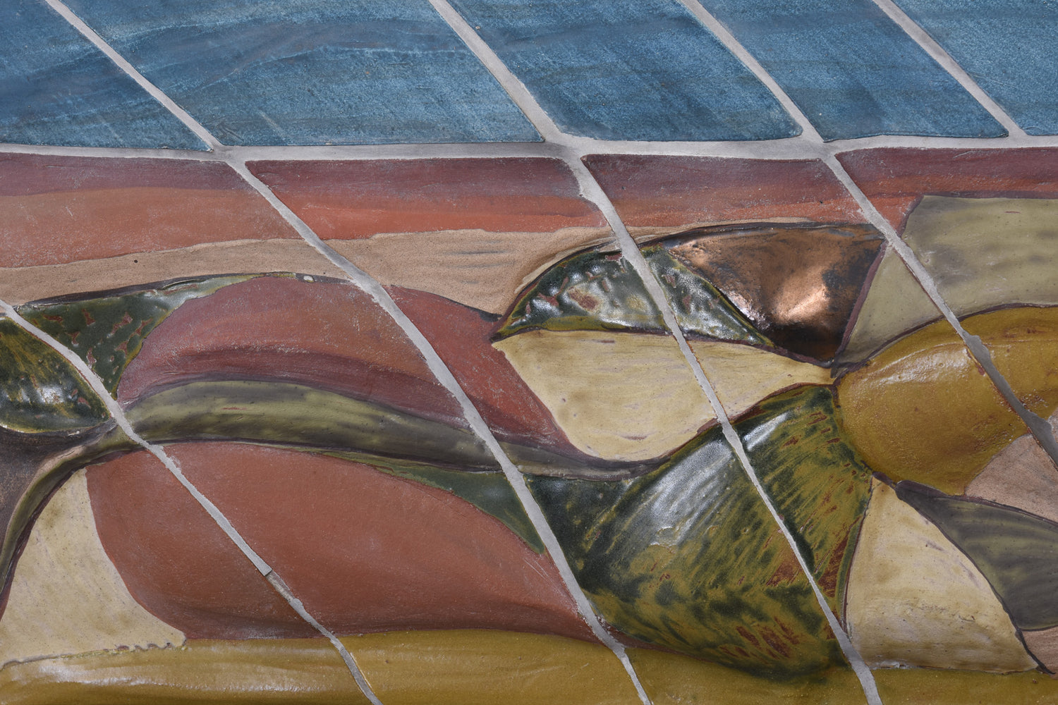 In this relief, the artist has modeled clay into smooth, flowing forms that are punctuated by scored line work. Upon first impression, we sense that the artist has observed scenes from nature, from the muted earthy tones and stone-like shape of the three-dimensional forms, to the suggestion of a blue-skied horizon. On closer viewing, the sculpted shapes evoke the fluid, muscular qualities of the human form.