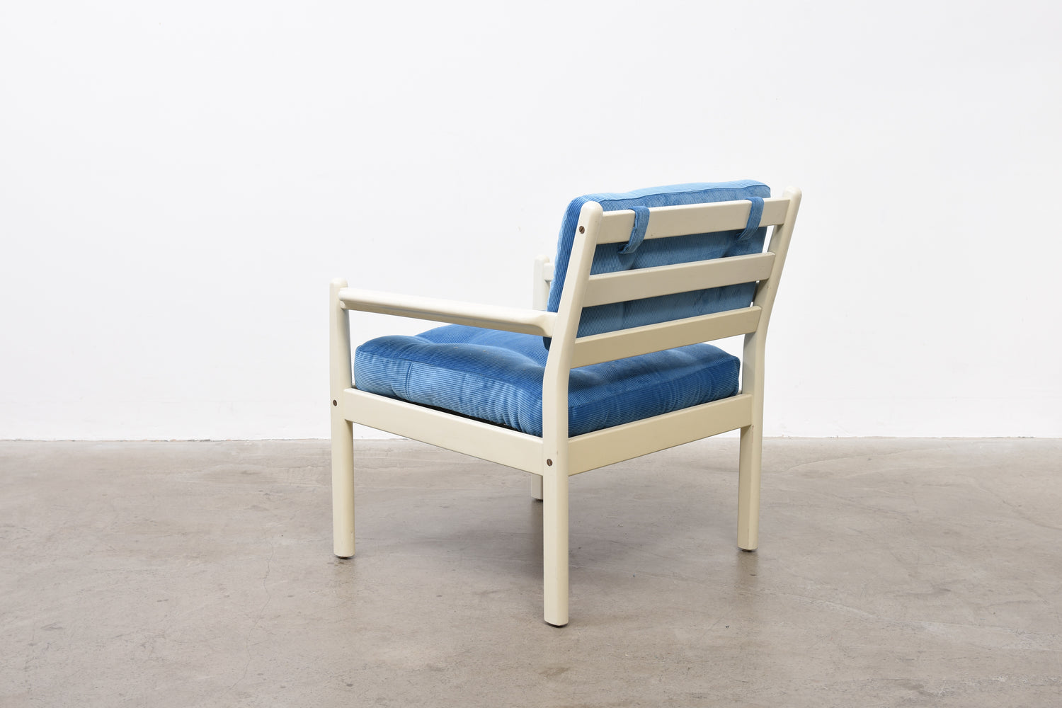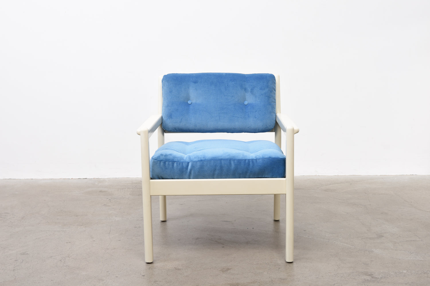 Vintage low back lounger with a lacquered beech frame and foam cushions newly upholstered in 100% cotton corduroy.