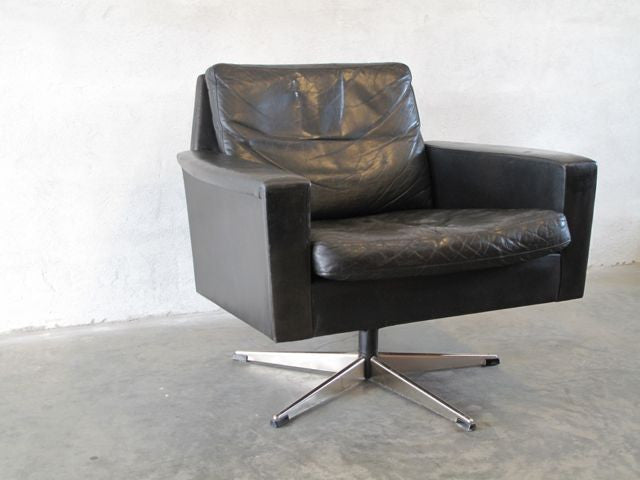1960s Danish lowback swivel chair in black leather and with chrome base.