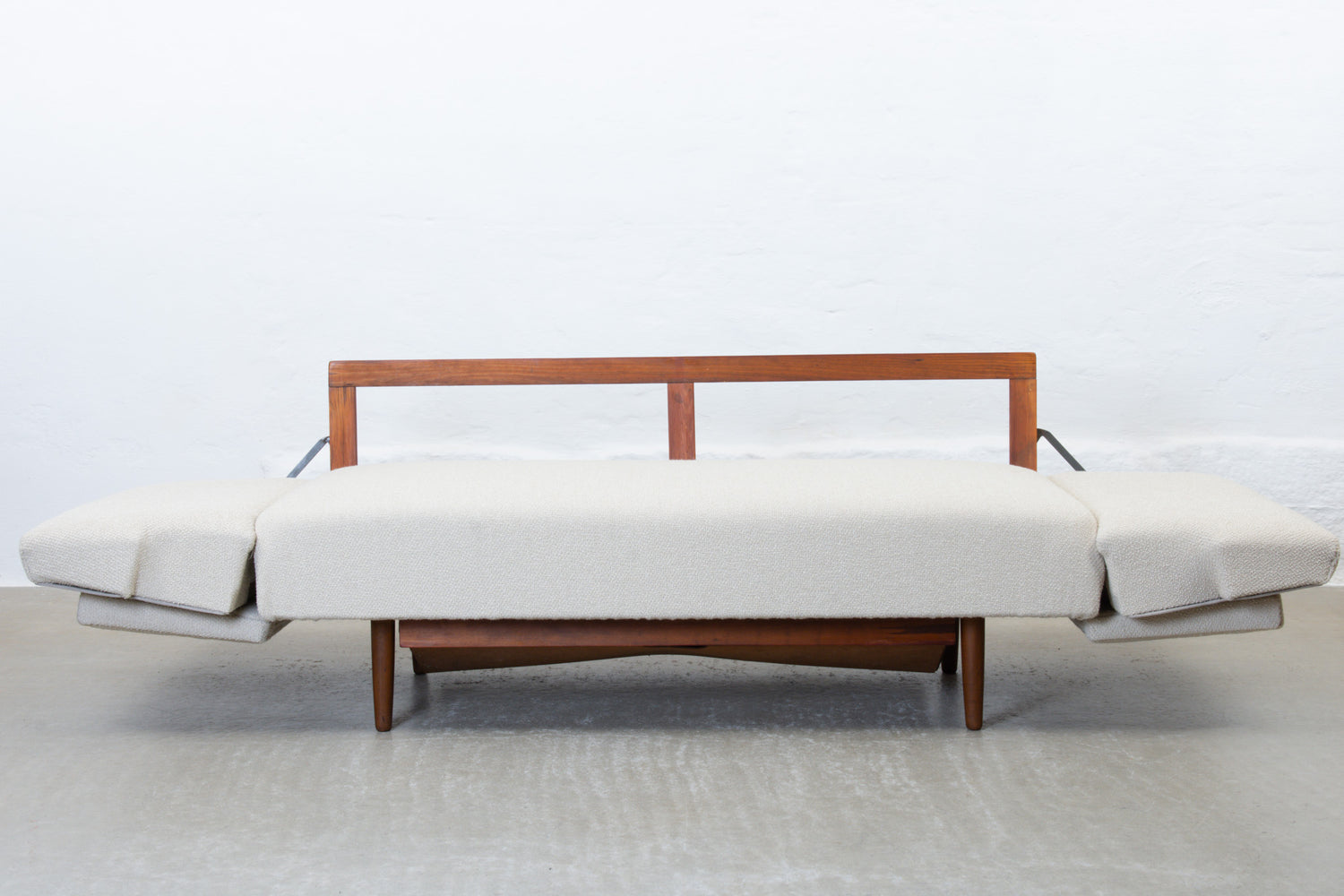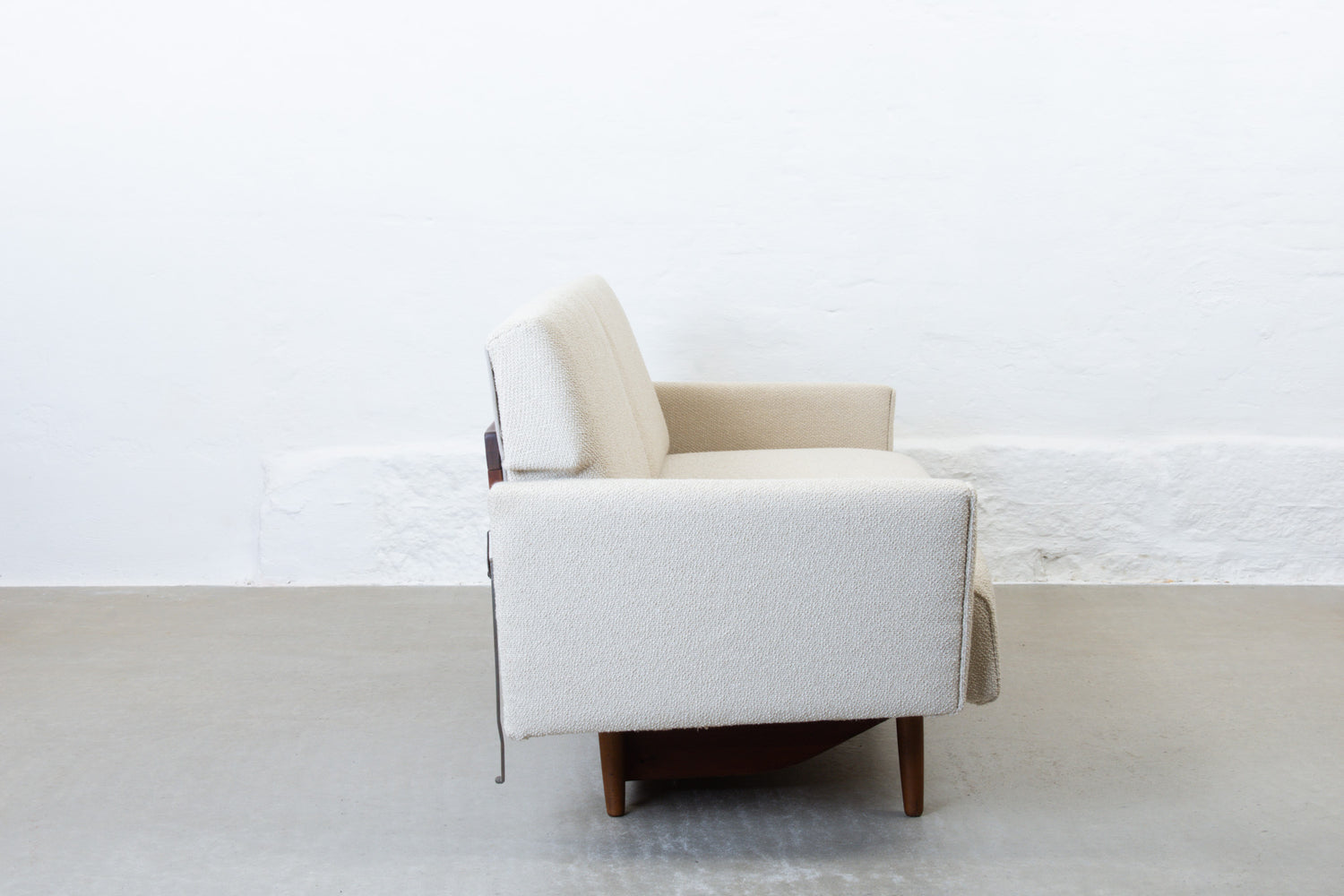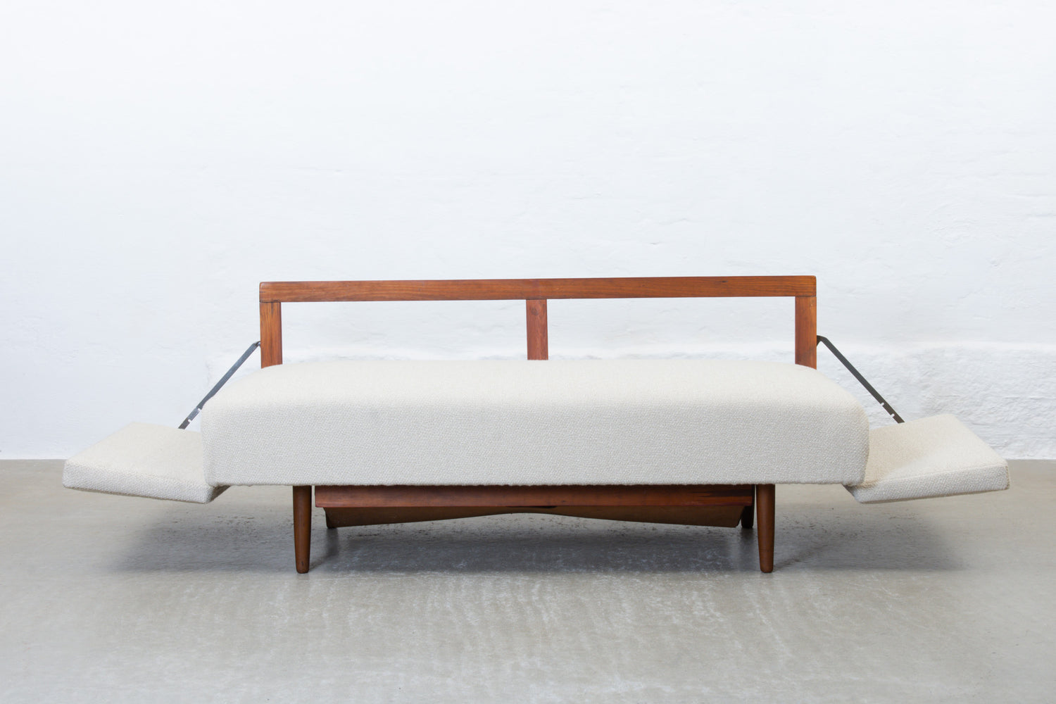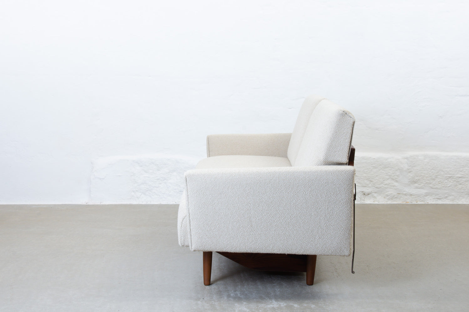 Two seat sofa bed with a sprung base, teak framing/legs and new upholstery in a textured cotton/wool blend by Yarn Collective.