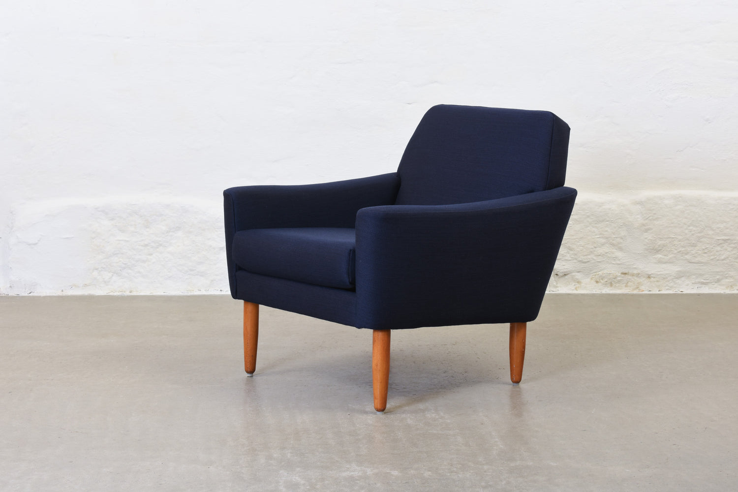 Low back lounge chair on turned beech legs. Newly reupholstered in navy wool.