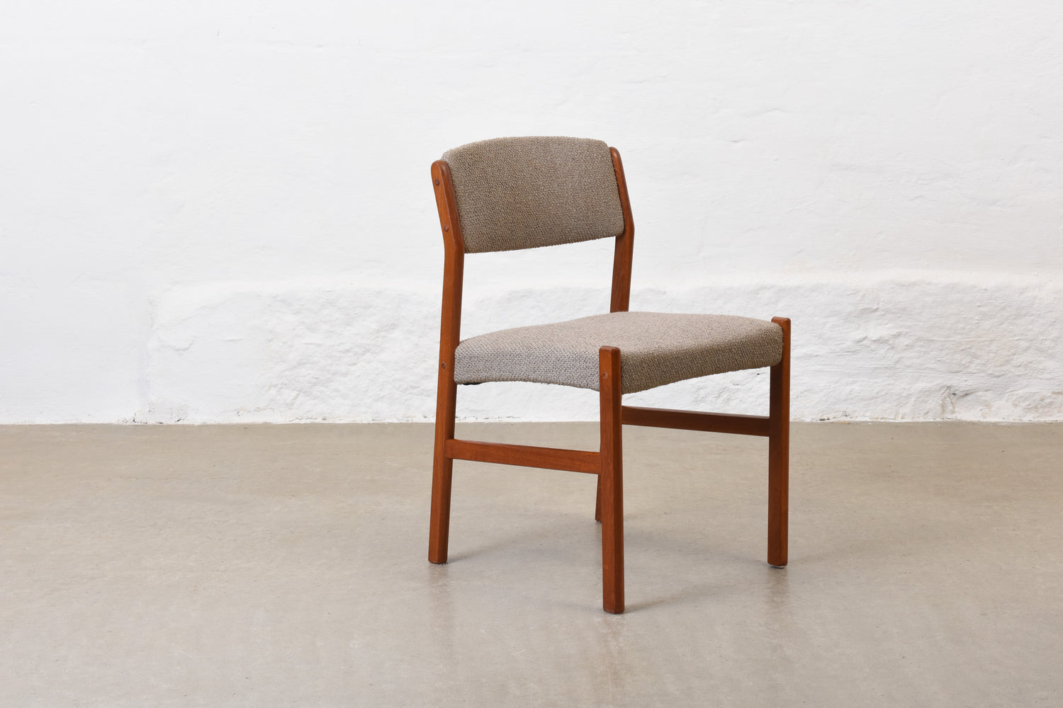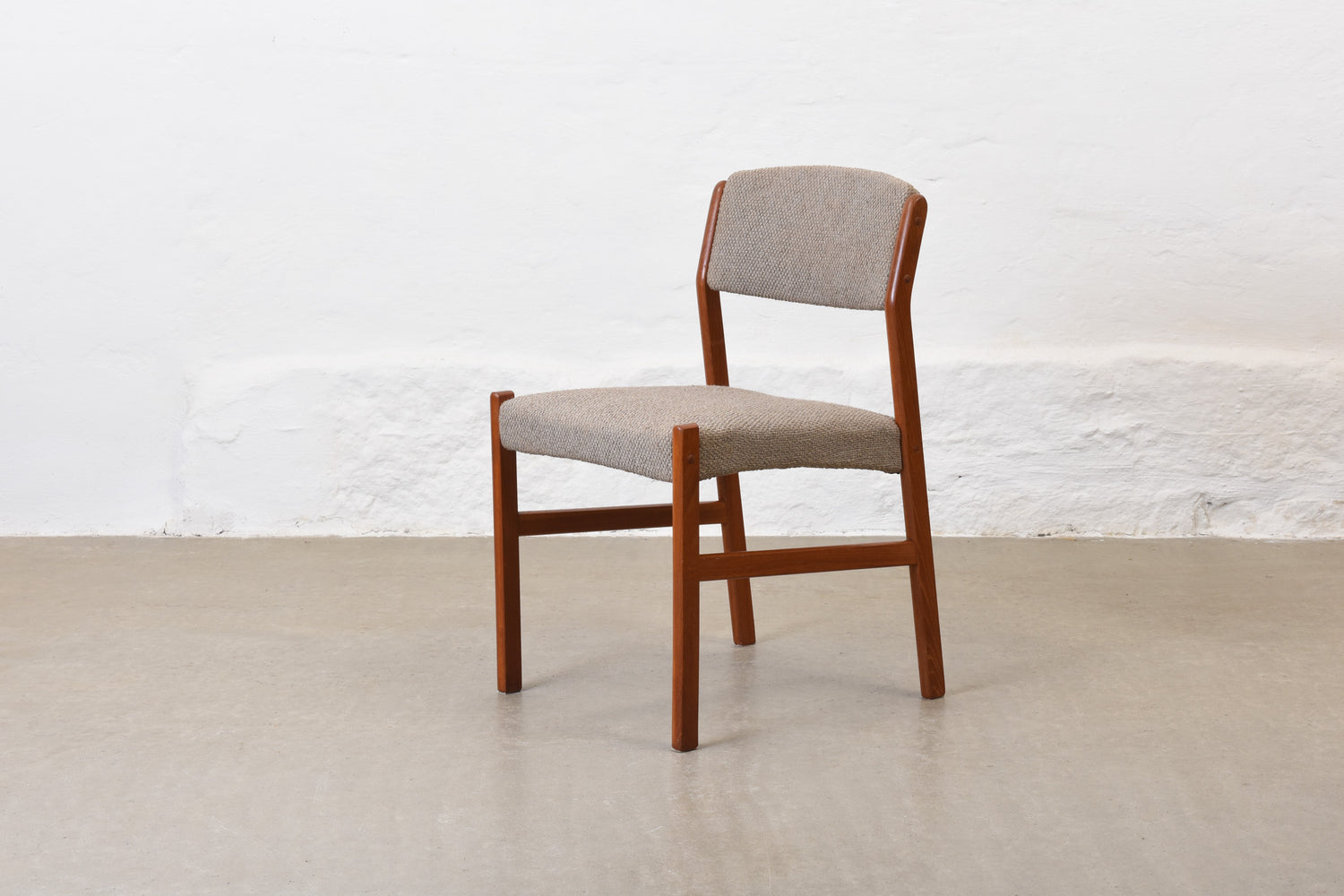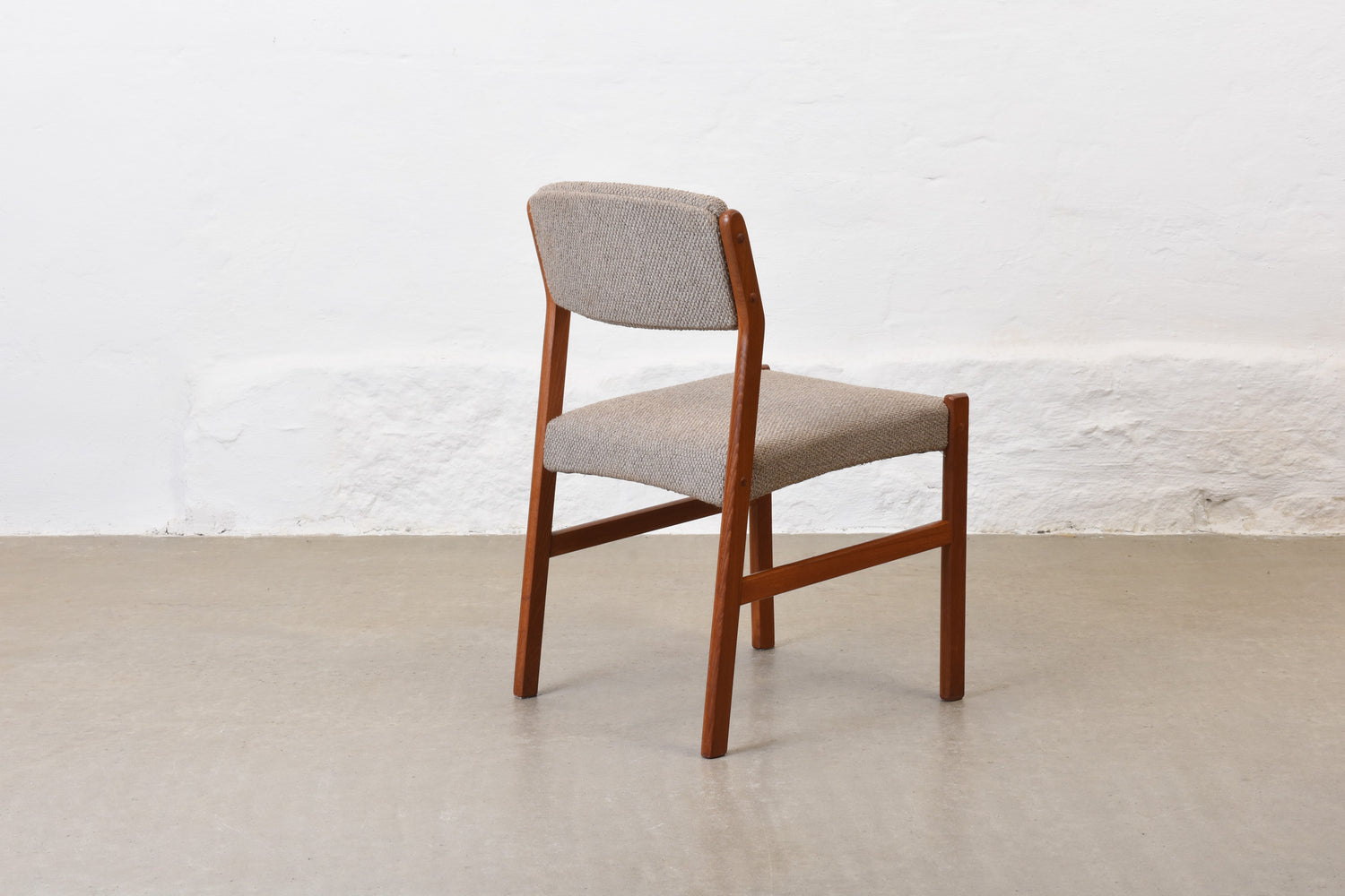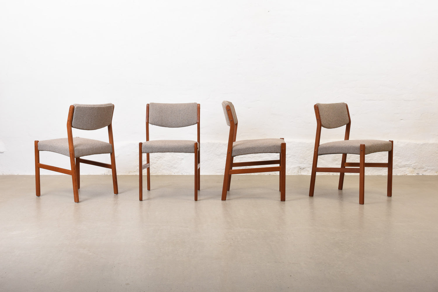 Set of four dining chairs with teak frames and padded seats/backs newly reupholstered in a textured cotton/wool blend by Yarn Collective.