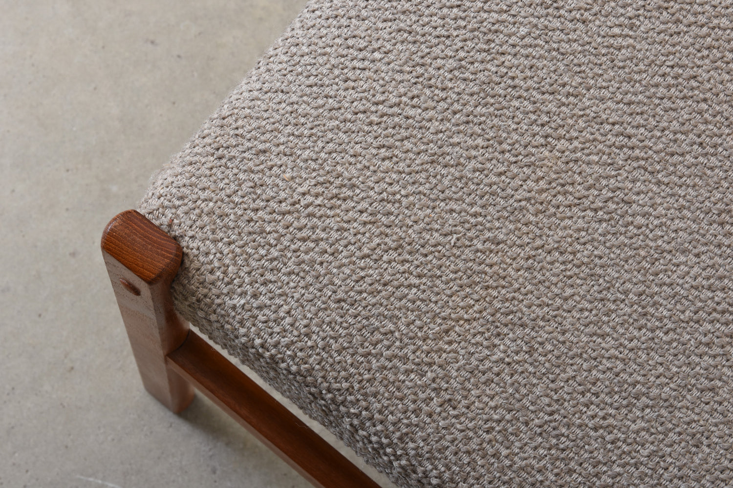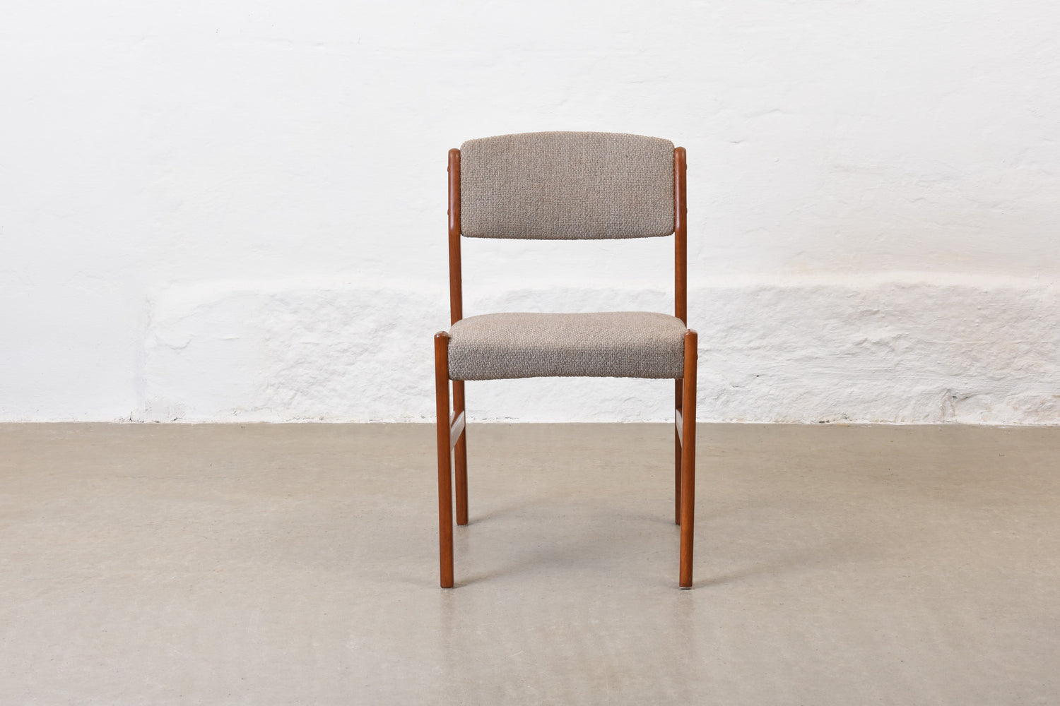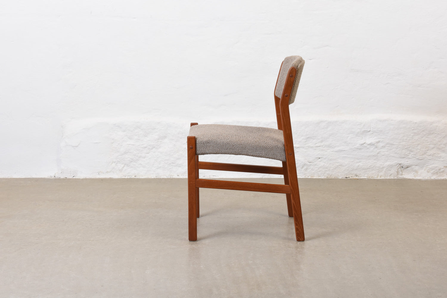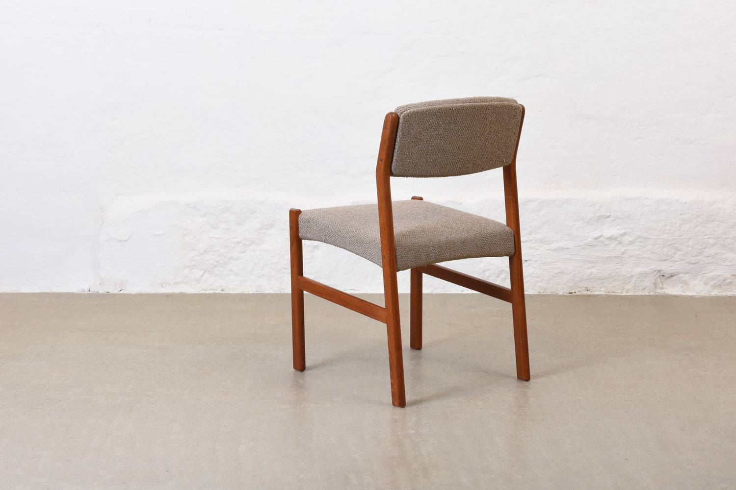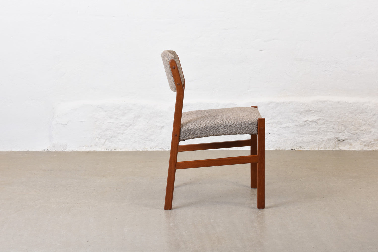 Set of four dining chairs with teak frames and padded seats/backs newly reupholstered in a textured cotton/wool blend by Yarn Collective.