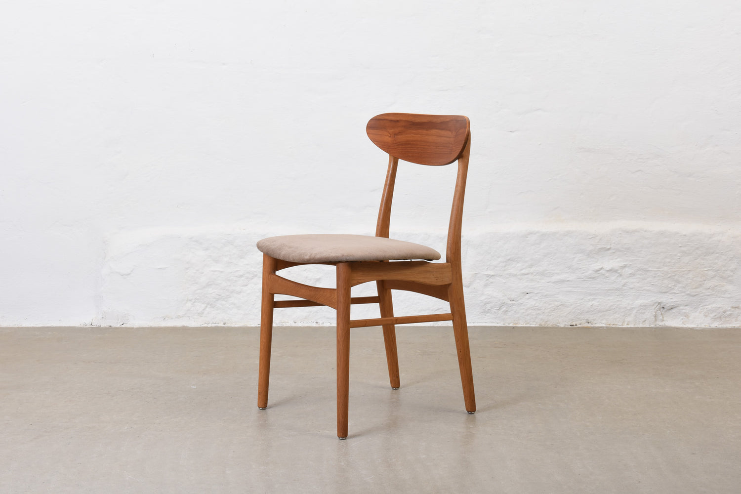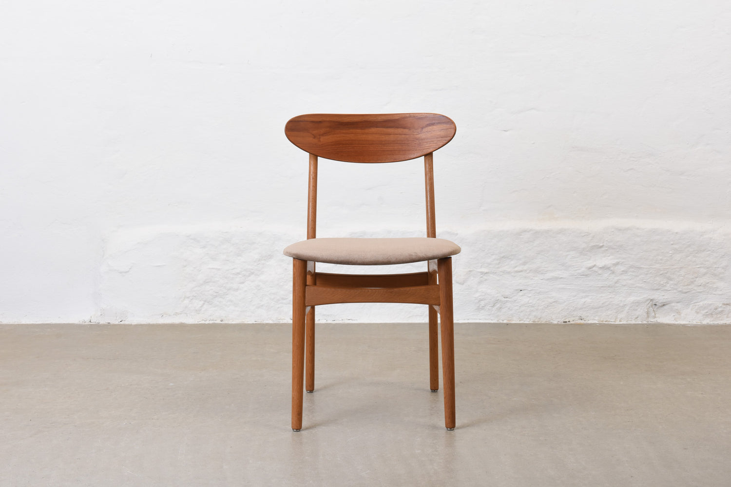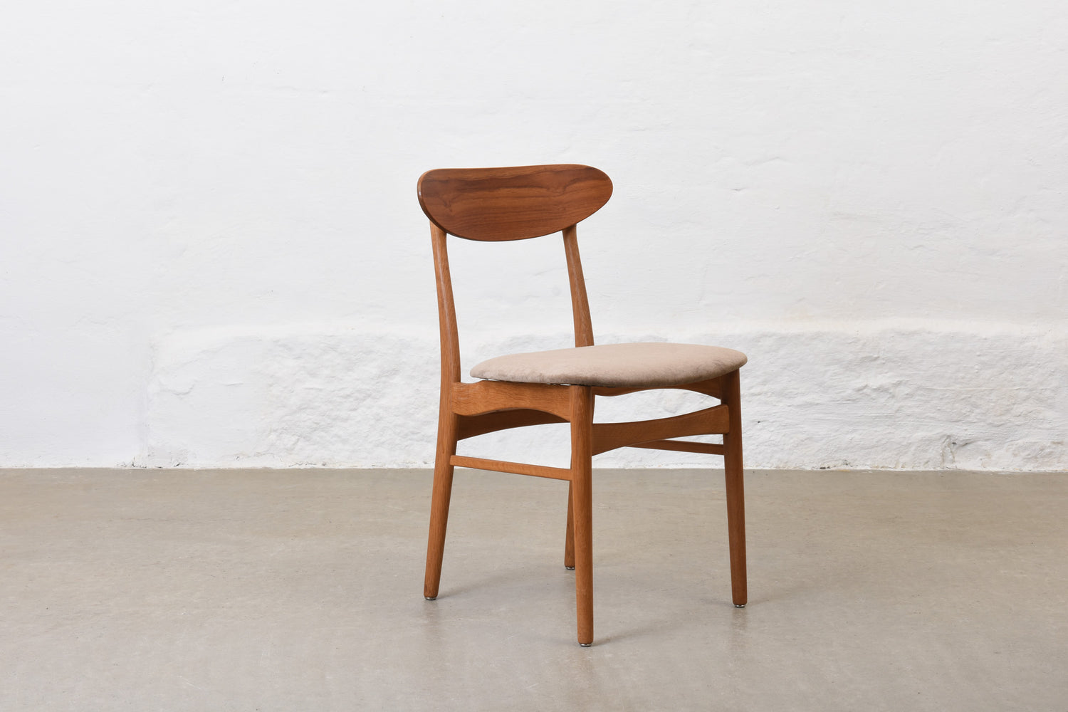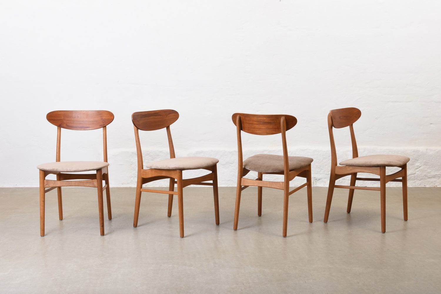 Newly reupholstered: 1960s set of four teak + oak dining chairs