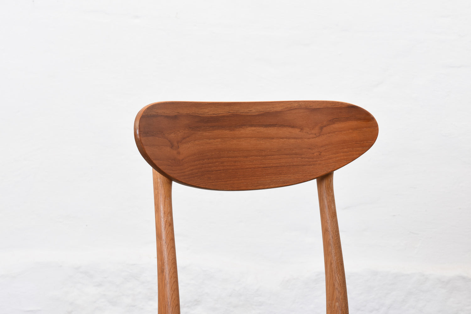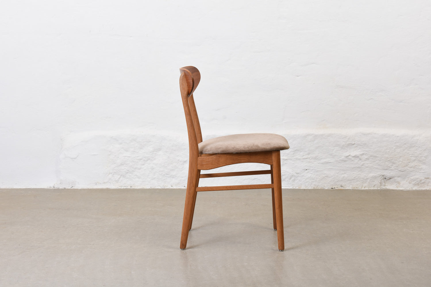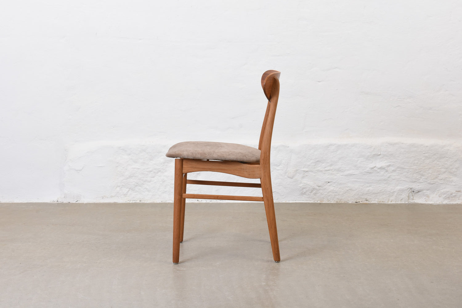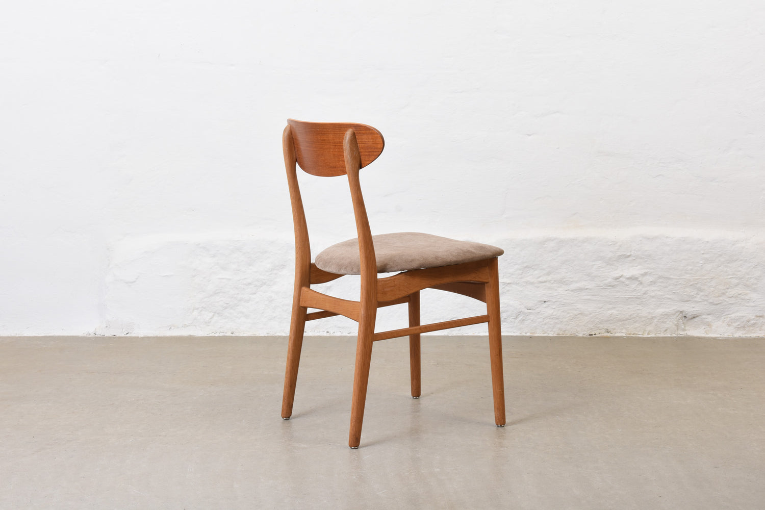 Newly reupholstered: 1960s set of four teak + oak dining chairs