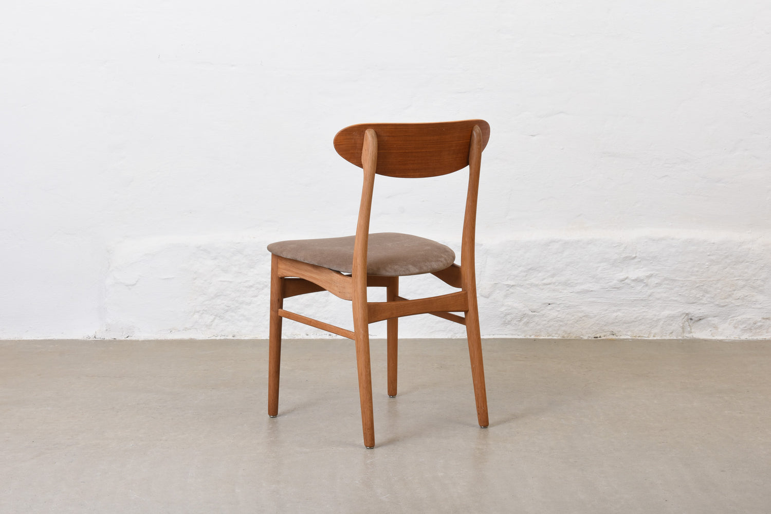 Set of four dining chairs with oak frames, teak backs and padded seats newly reupholstered in cotton velvet.