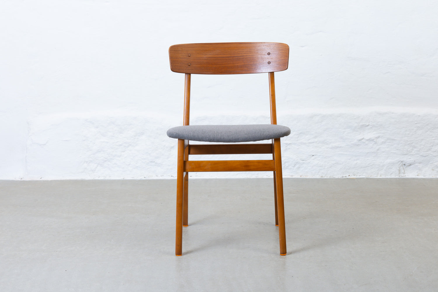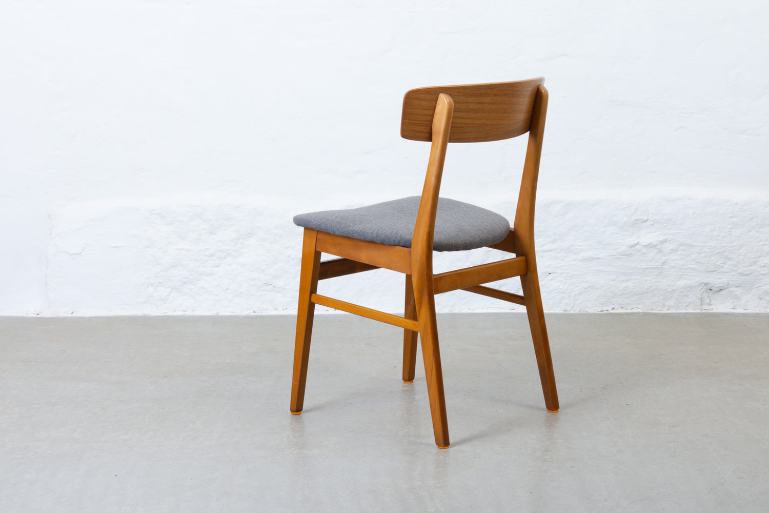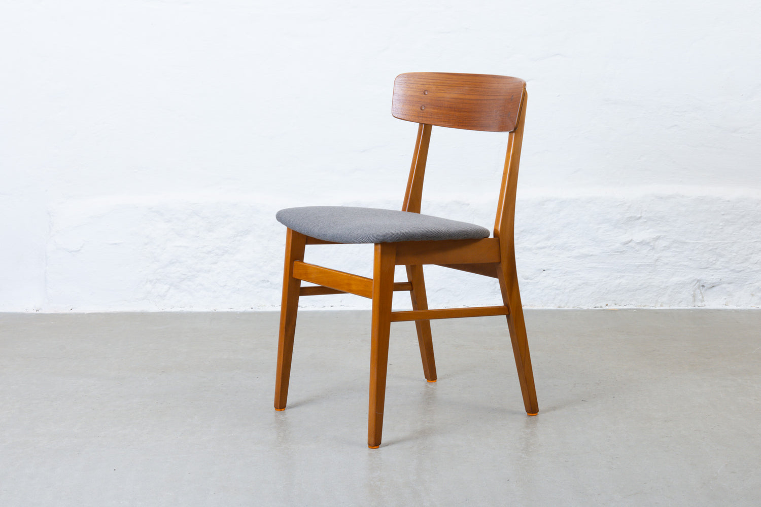 Matching set of four dining chairs with teak backs, beech frames and padded seats newly reupholstered in a lead grey wool.