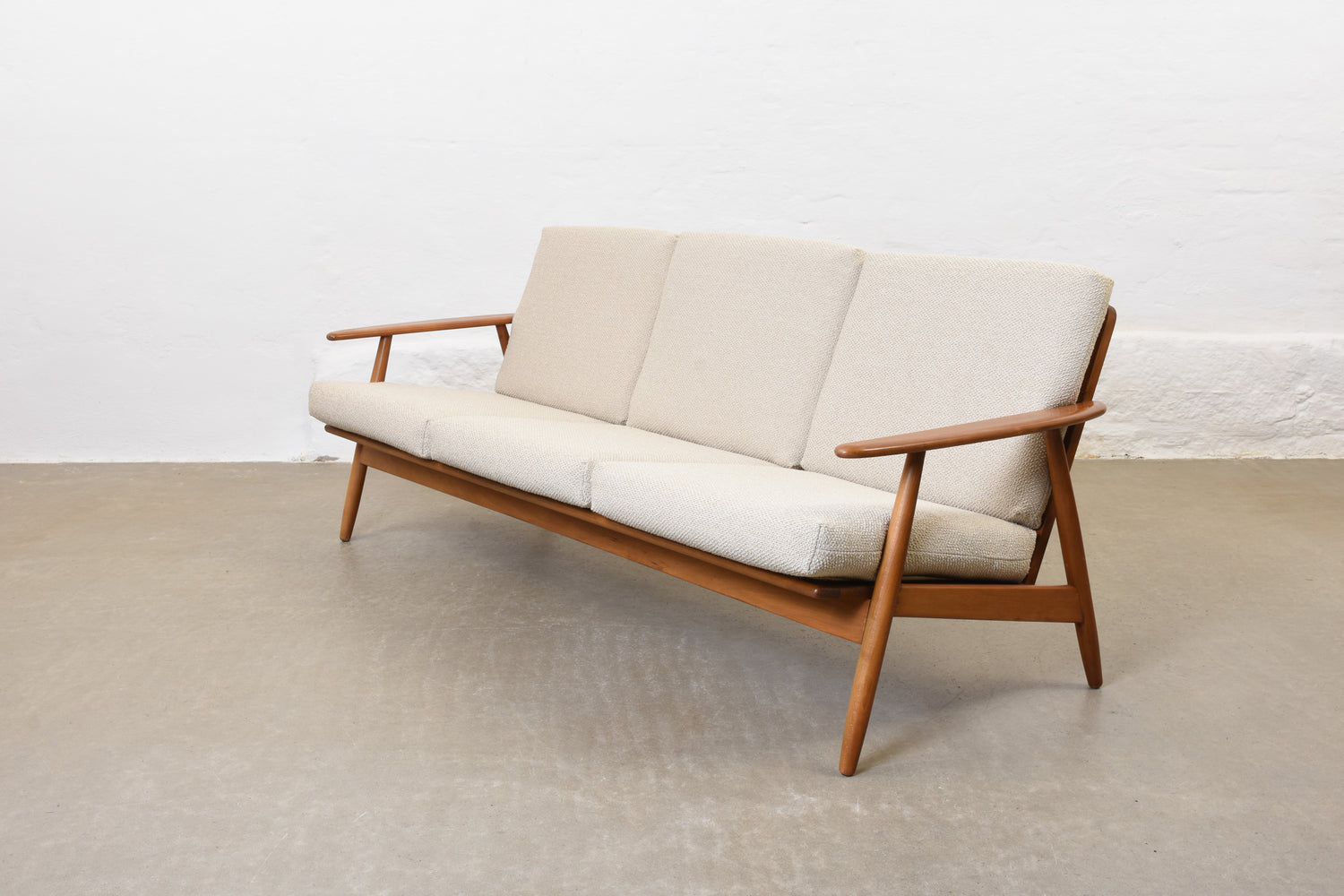 Three seat sofa with a solid beech frame and six loose foam-filled cushions newly reupholstered in a thick-knit cotton wool blend by Yarn Collective.