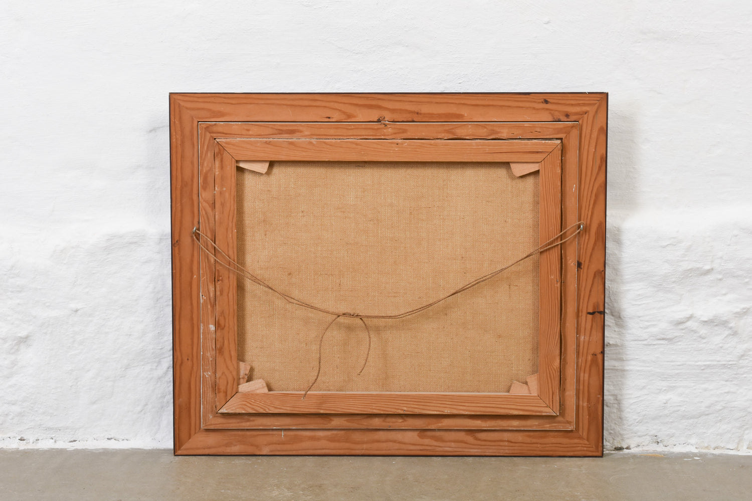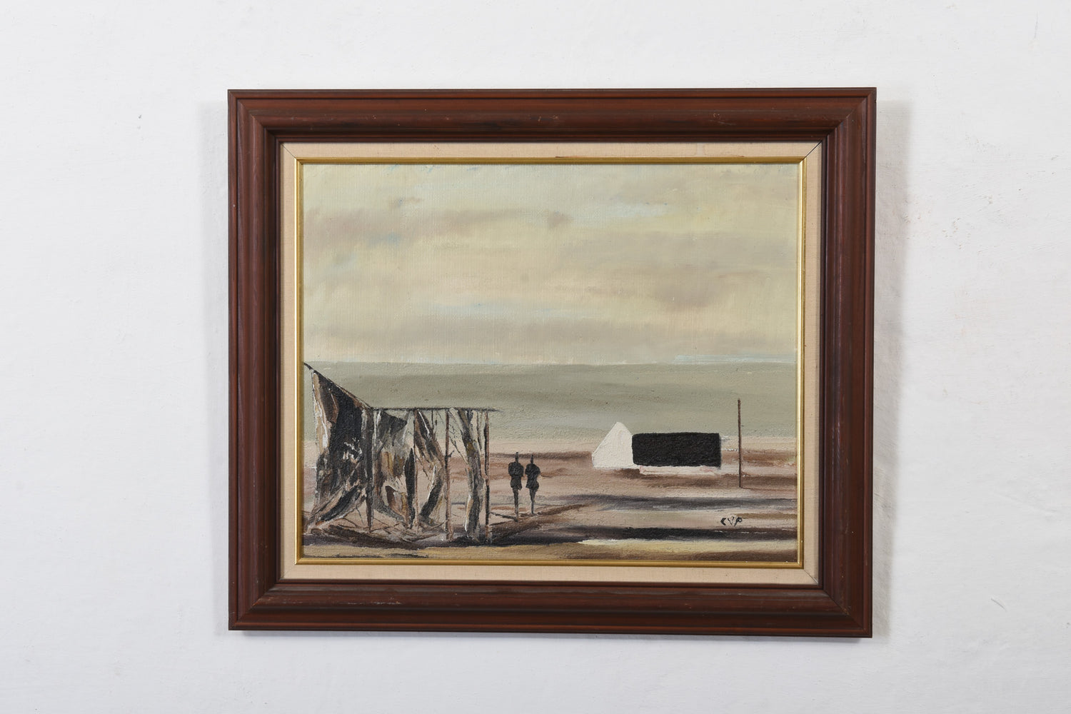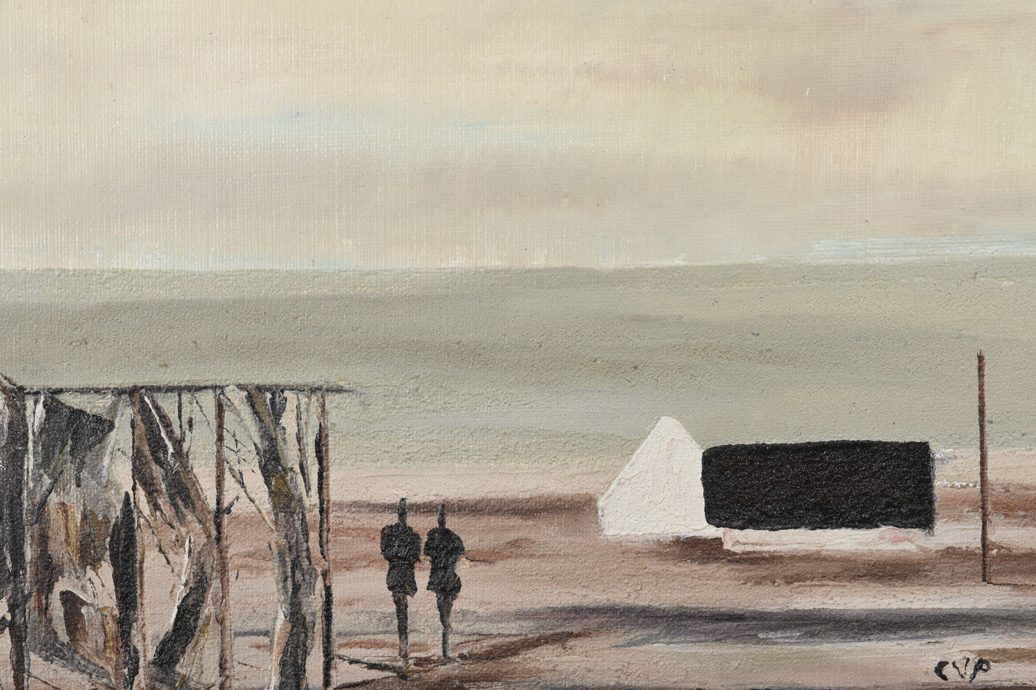 In this oil on canvas, signed ‘CVP’, the artist appears to be interested in depicting the essence of the natural world. Pale blues and warm greys evoke the atmospheric qualities of a calm, overcast day by the sea, while the weathered structure on the left reminds us of the power and effects of nature. Against the contrast of the paler hues of this landscape, our eye is drawn to the two dark figures, whose anonymous silhouettes create a sense of mystery and narrative.