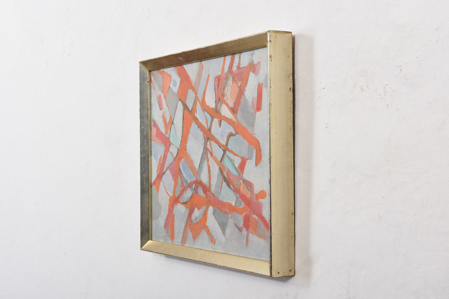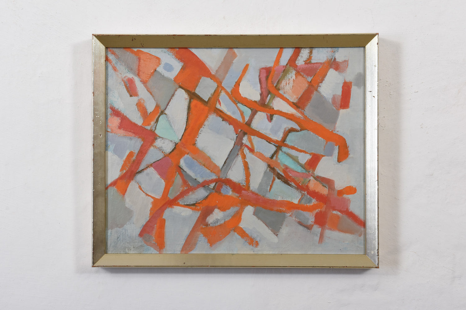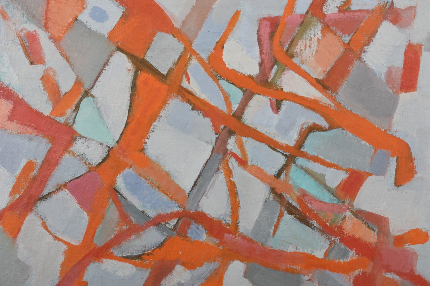 The striking composition is structured by a number of parallel and diagonal lines, and through their repetition, the artist has created a feeling of animation and energy as they cascade across the canvas. Among the intertwining red and orange brushwork, we see how the artist has built a series of shapes formed in the negative spaces found in between the diagonal lines. These shapes add depth to the painting and provide balance to the overall composition.