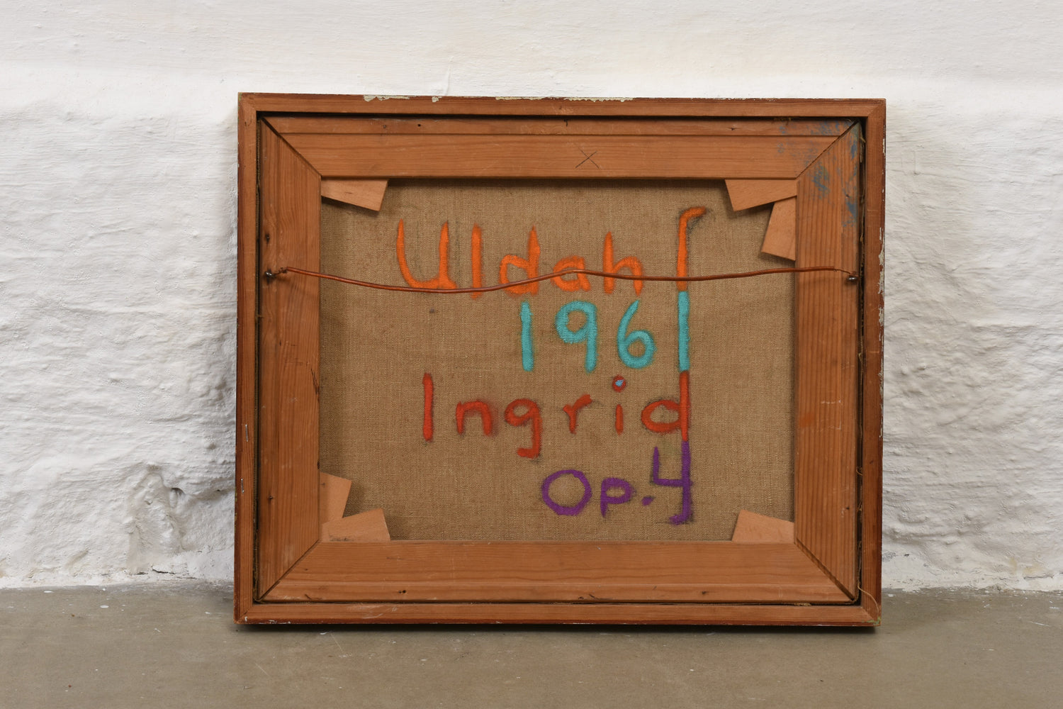 In this oil painting, artist Ingrid Uldahl has brought together an explosion of vivid reds and oranges to create a bold statement. These warm, expressive marks provide a sharp contrast to the minimal background of subtler, cool tones.
