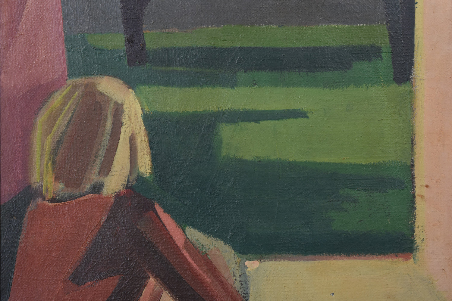 In this oil on canvas, the use of primary colours to depict the figure, combined with the use of dramatic light and shadow, immediately draws our eye to the sitter of the painting. These bold shadows and the exploration of how light is expressed through paint is a typical hallmark of work by the artist, who often used the technique to emphasise the mood of a scene.