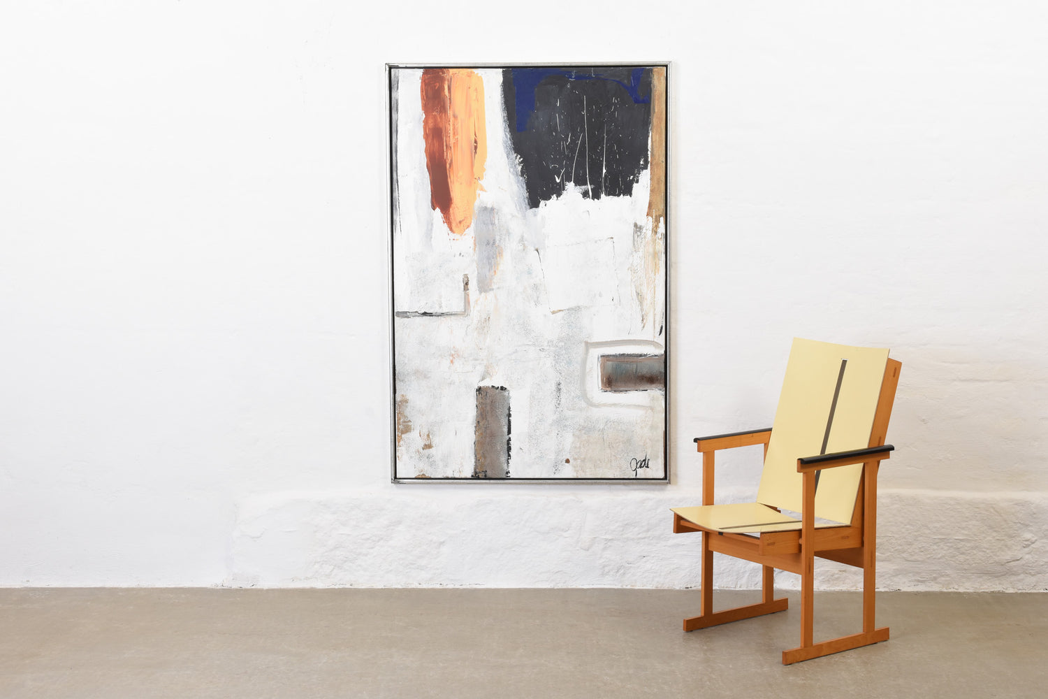 In this large-scale oil on canvas, bold, expressive forms come together to create a striking statement. Through the vivid use of black and white, the artist has placed a strong emphasis on the visual qualities of contrast and balance.