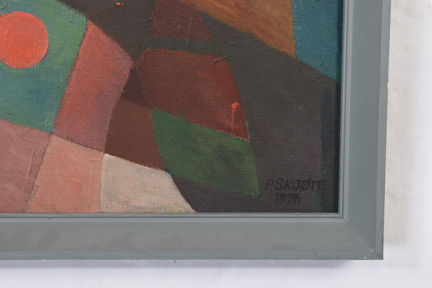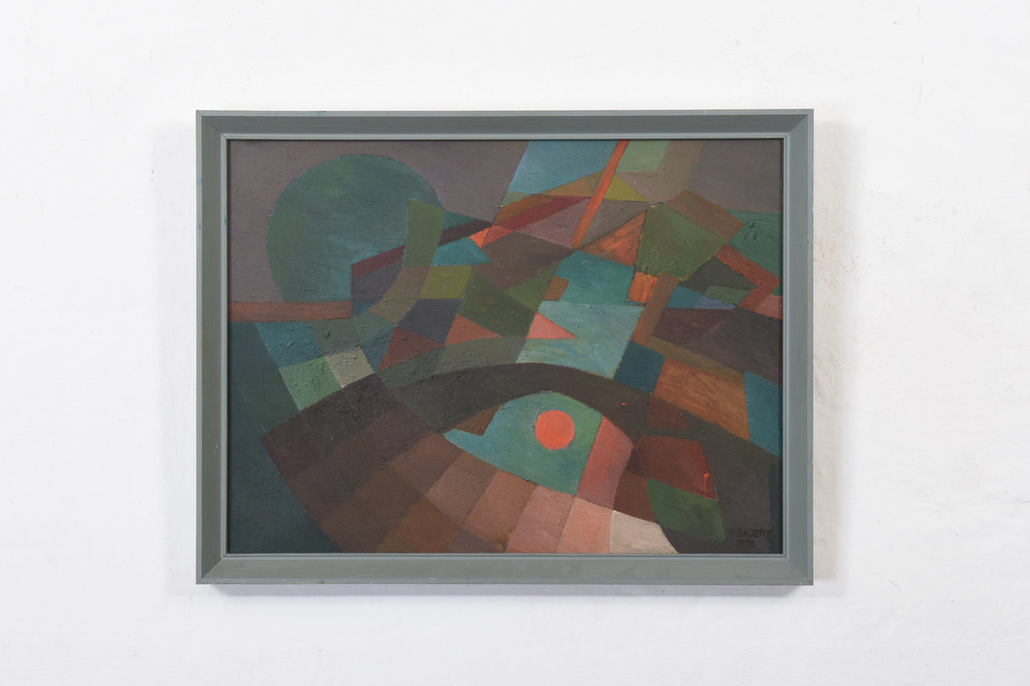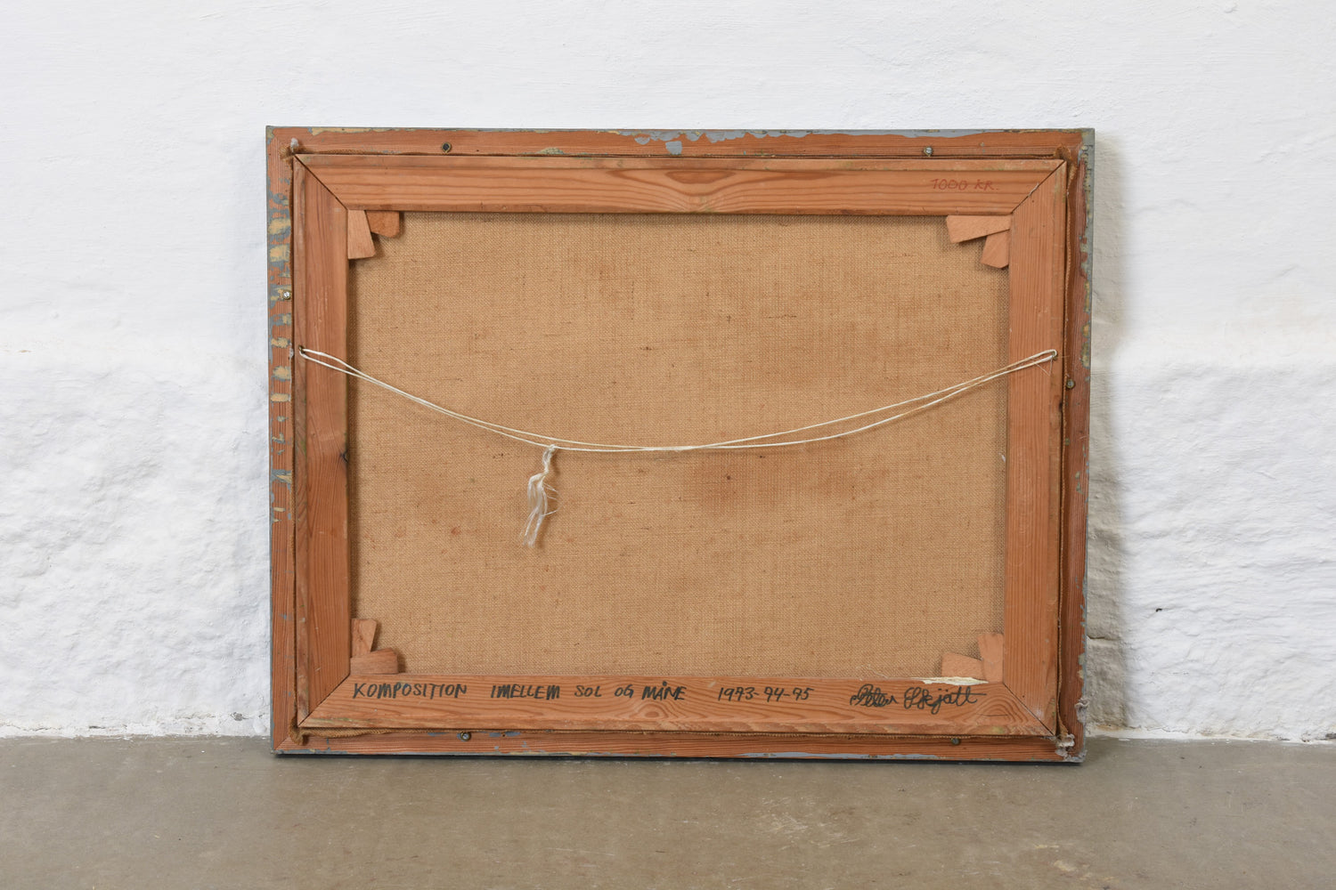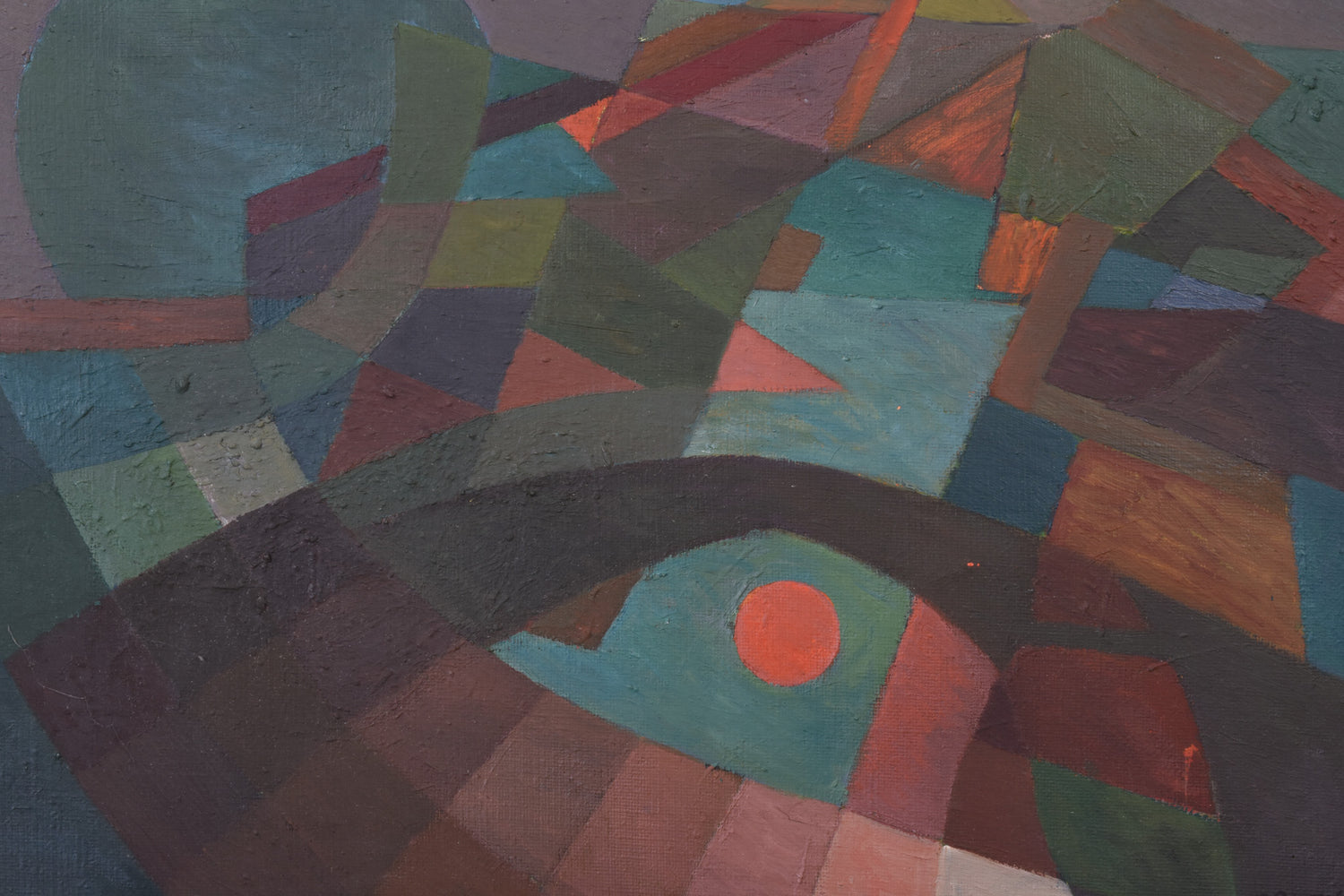 In this oil on canvas, we immediately notice how the artist has captured the feeling of movement. Our eye initially focuses on the red sphere as our gaze sweeps upwards in a curved motion, exploring a world of warm hues and earthy tones. On the reverse of the canvas, the text reads Composition in between the Sun and the Moon.