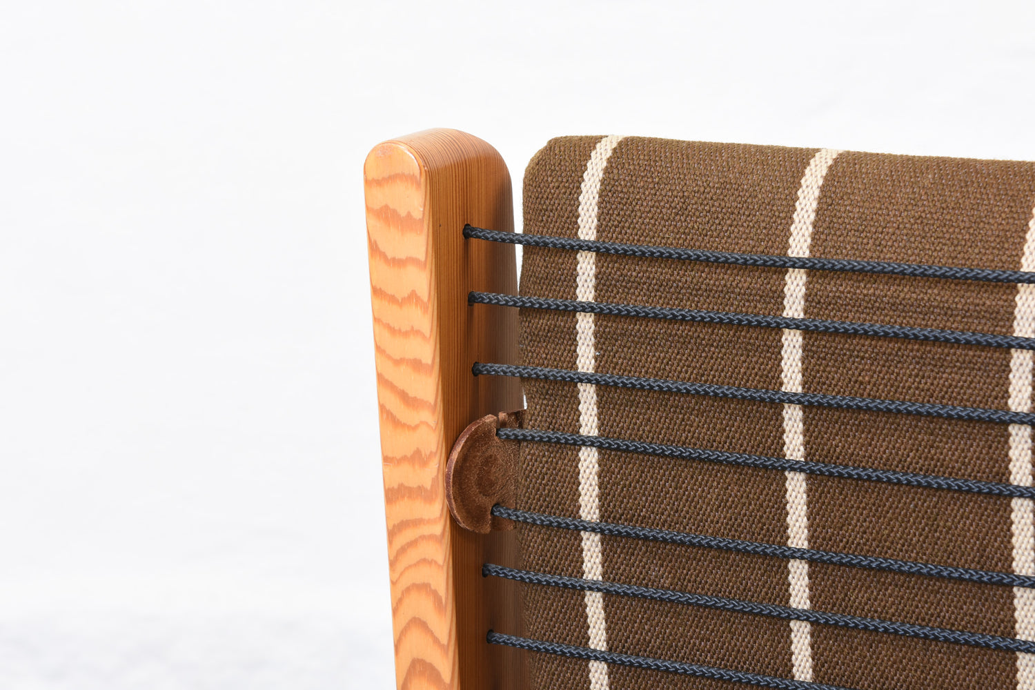 Dining chair in pitch pine with black cord seat and backrest supports. Chair features its original foam cushions and striped wool upholstery with leather details.