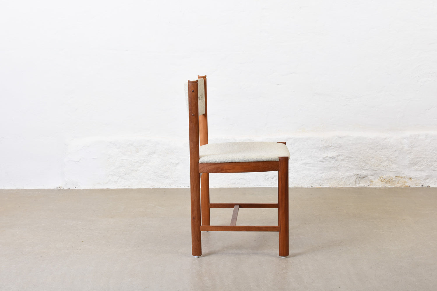 Matching pair of chairs with teak frames and their original wool upholstery.