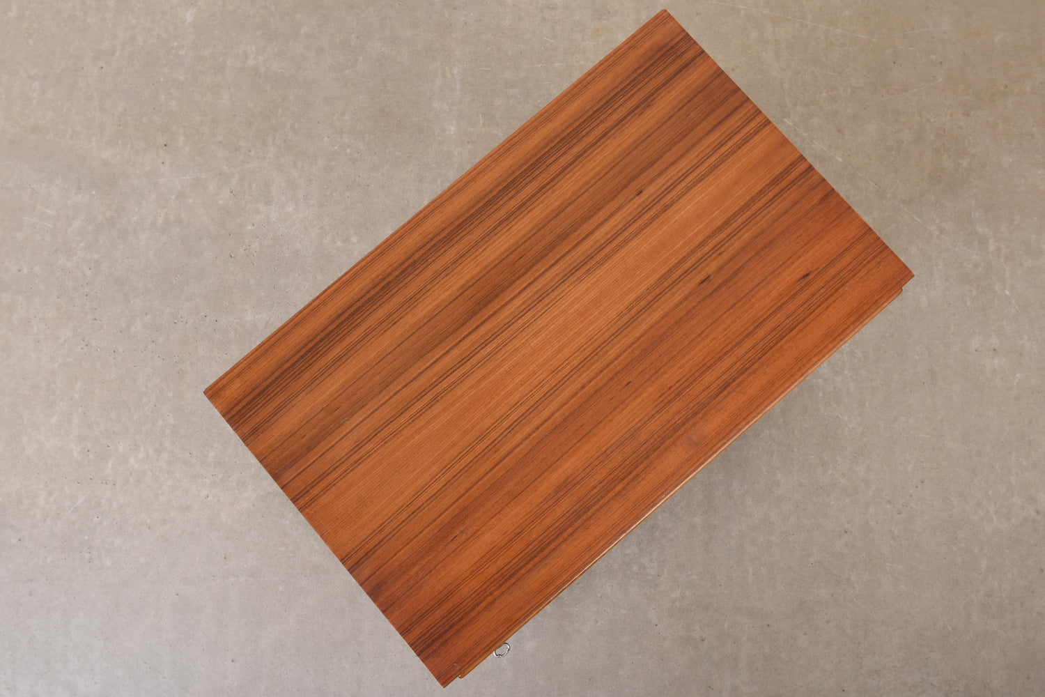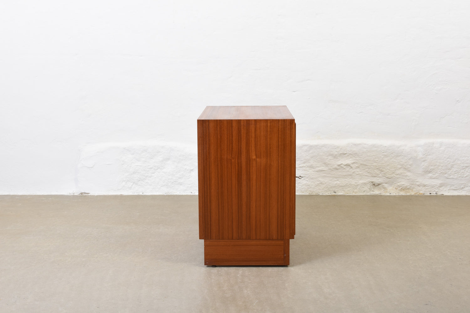 Matching pair of locking short sideboards in teak with birch interiors and adjustable internal shelving.