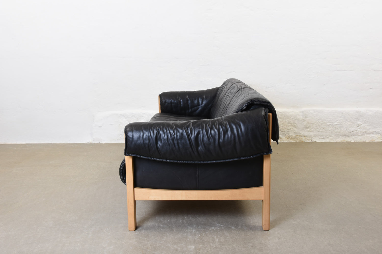 Vintage three seat sofa with a beech frame and padded cushions upholstered in black leather.