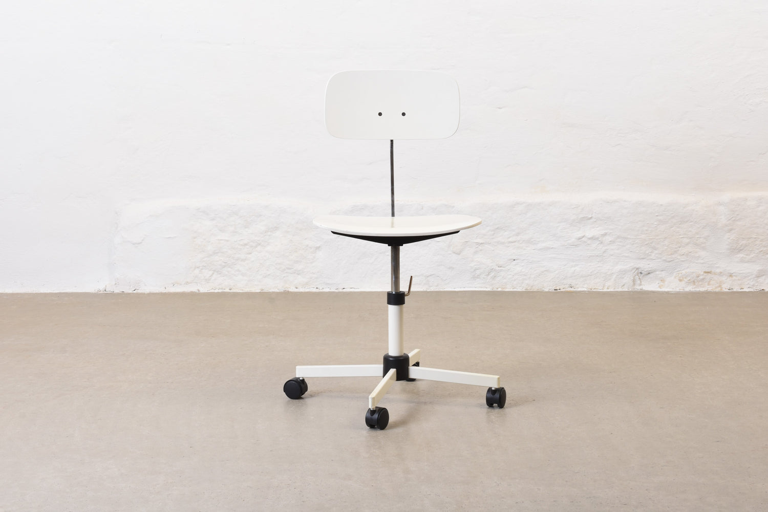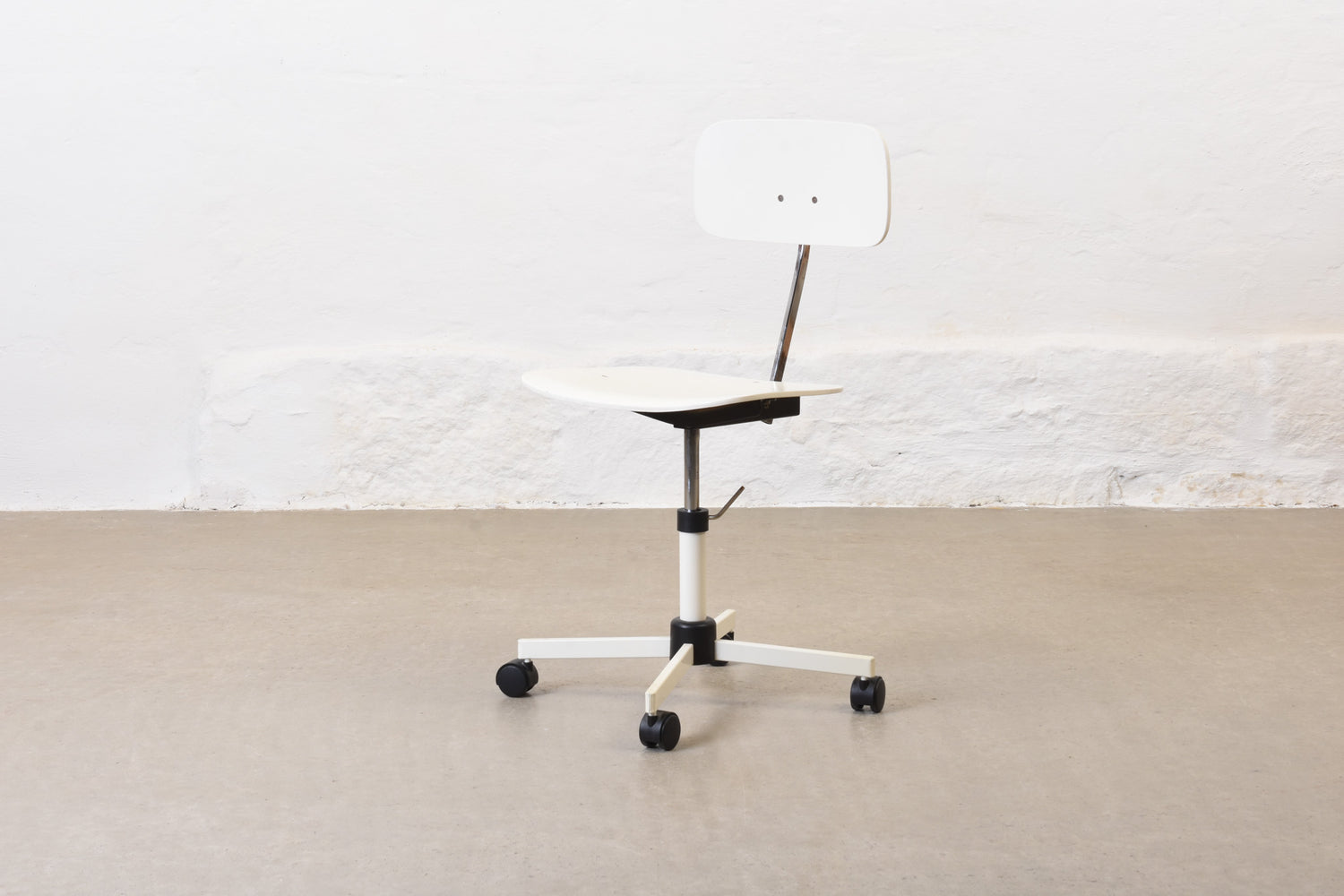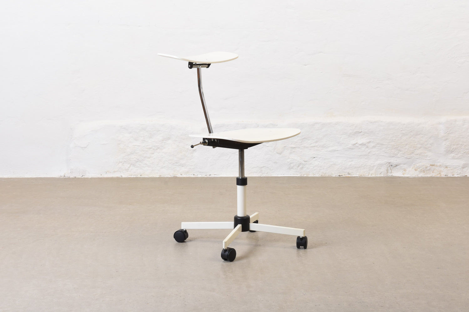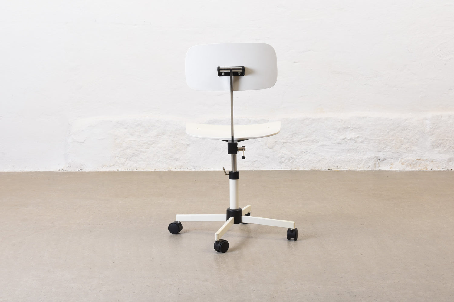 Vintage architect's chair with a white-lacquered seat/backrest in beech ply, metal base and its original castors. The seat and back rest are fully adjustable.
