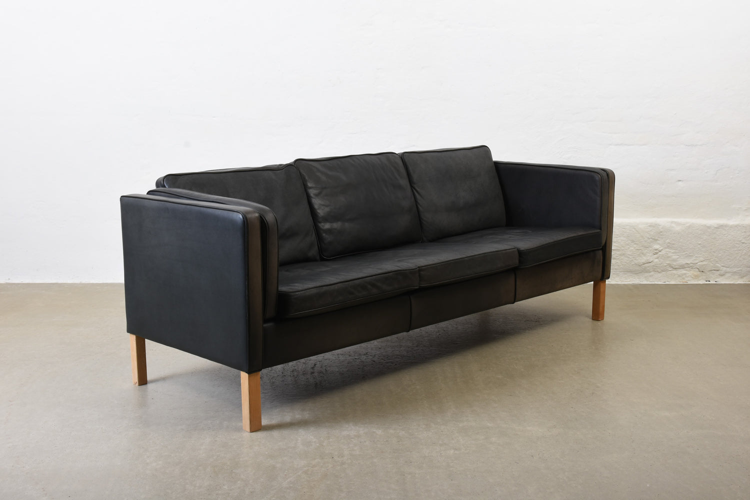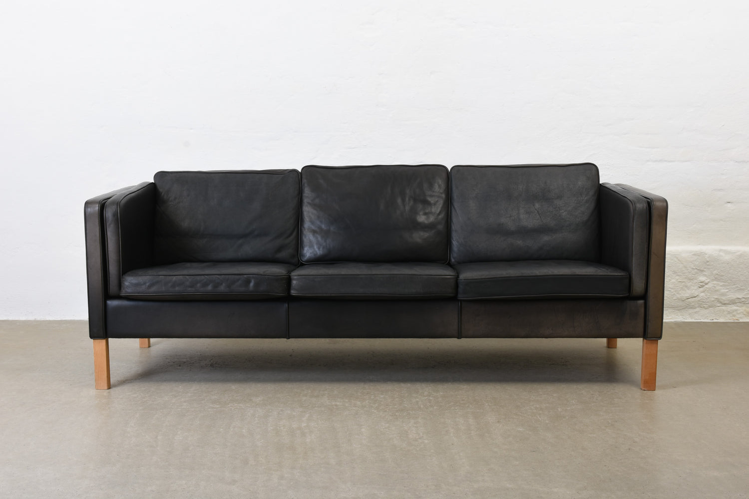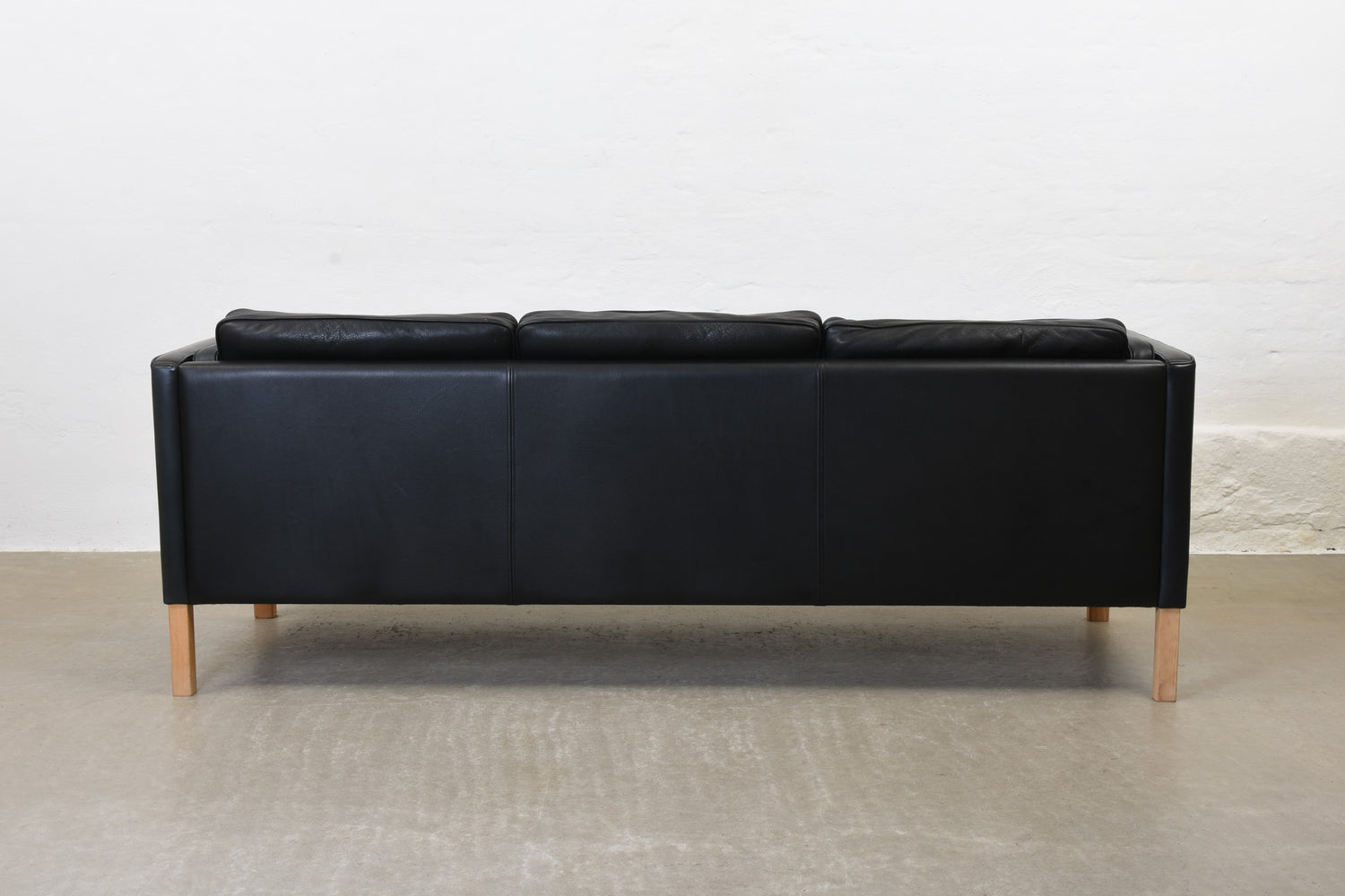 Vintage three seat sofa upholstered in its original charcoal black leather. Features eight loose foam and feather filled cushions and sits on squared beech legs.