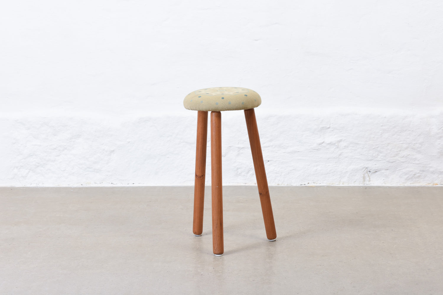 Three-legged stool with oak legs and padded seat upholstered in its original embroidered fabric.