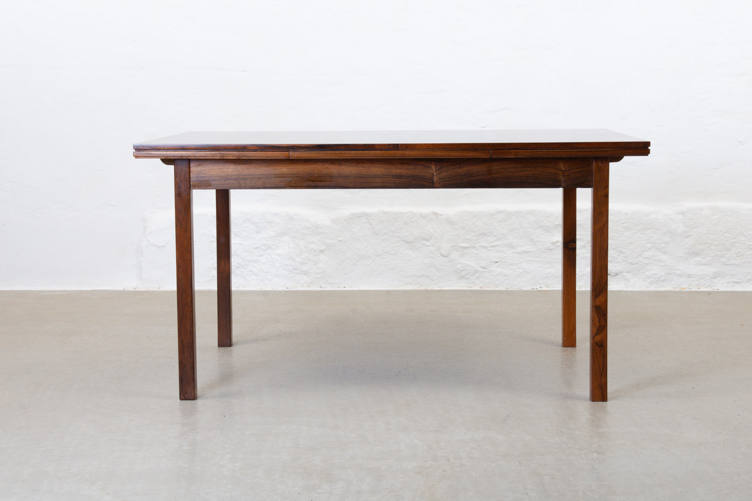 Extending dining table in rosewood with two hidden pull-out extension leaves. Sits six normally and up to eight comfortably when fully extended.