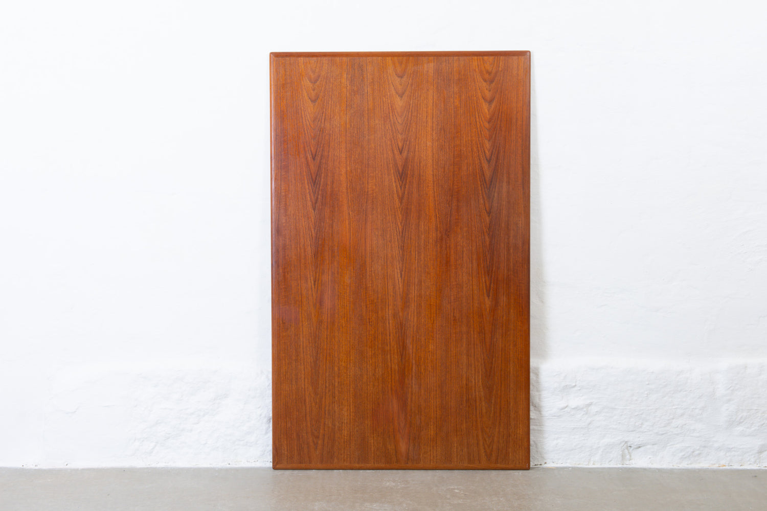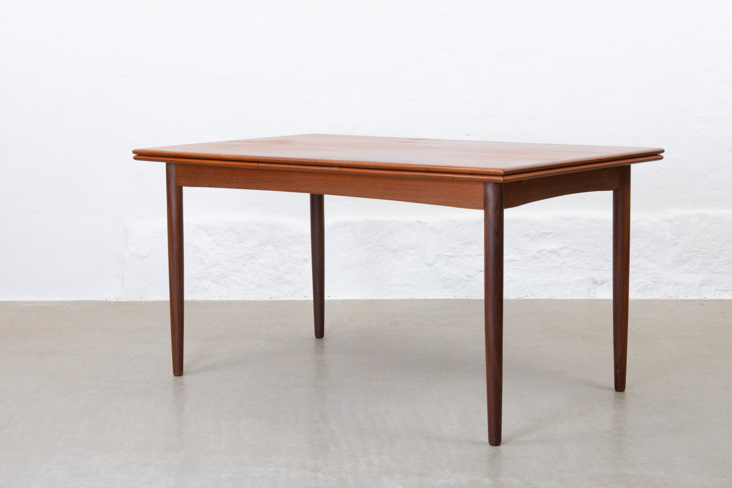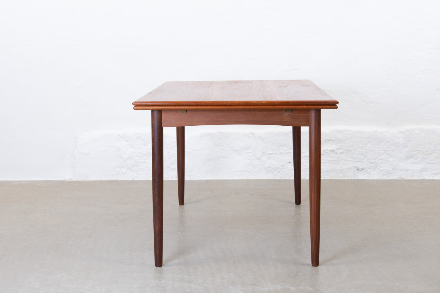 Extending dining table in teak with two hidden pull-out extension leaves. Sits six normally and up to ten comfortably when fully extended.