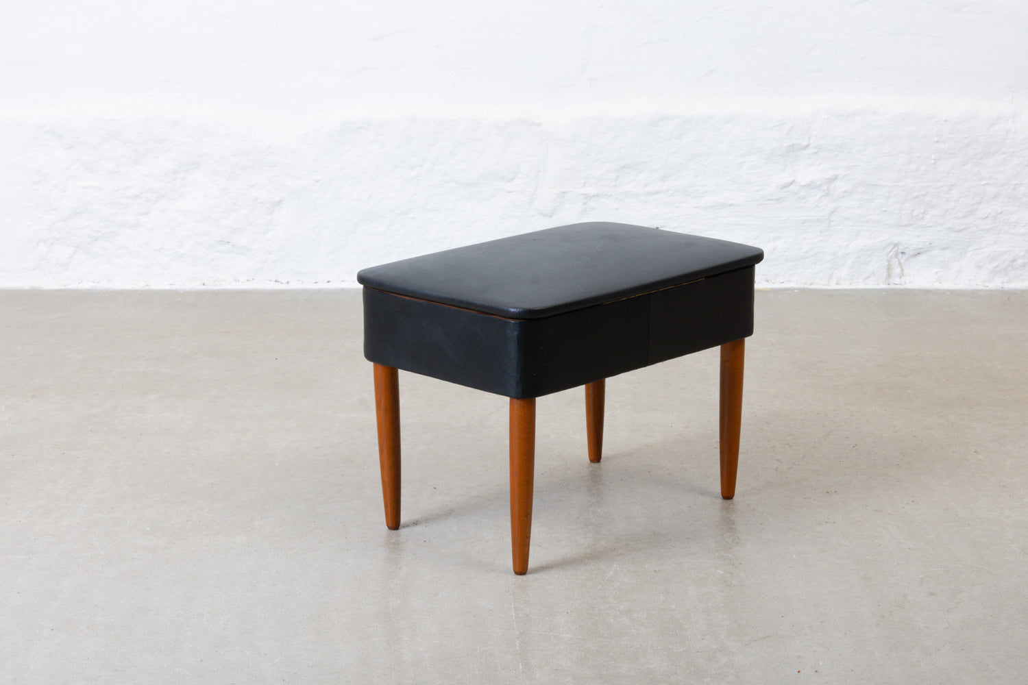Foot stool upholstered in vinyl. Sits on tapered beech legs and features a flip-up top with internal storage.