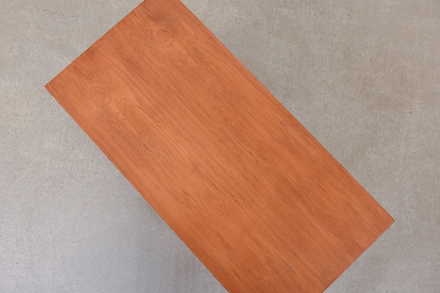 Twin pedestal desk in teak with a selection of six drawers. Perched on turned solid teak legs.