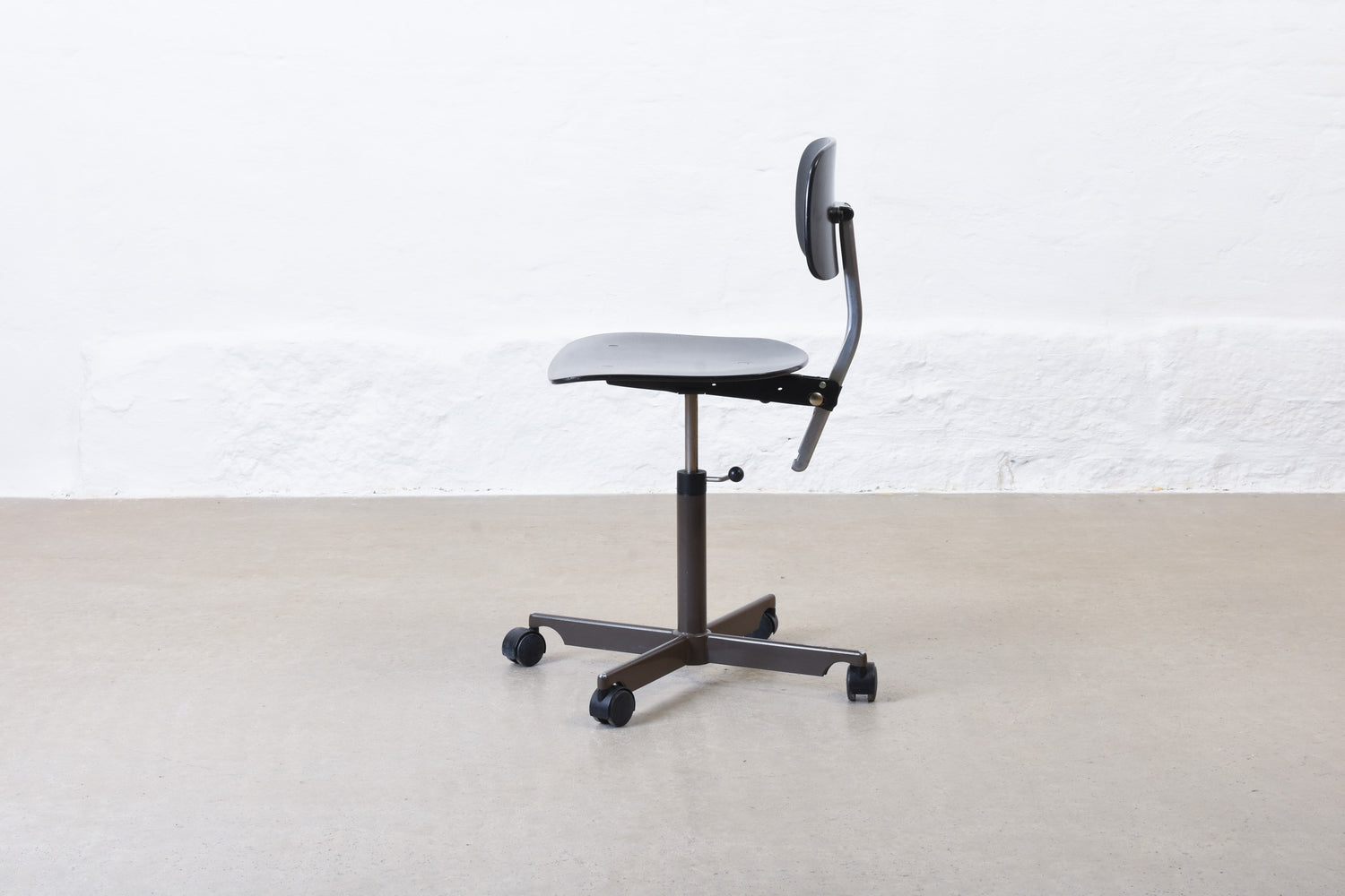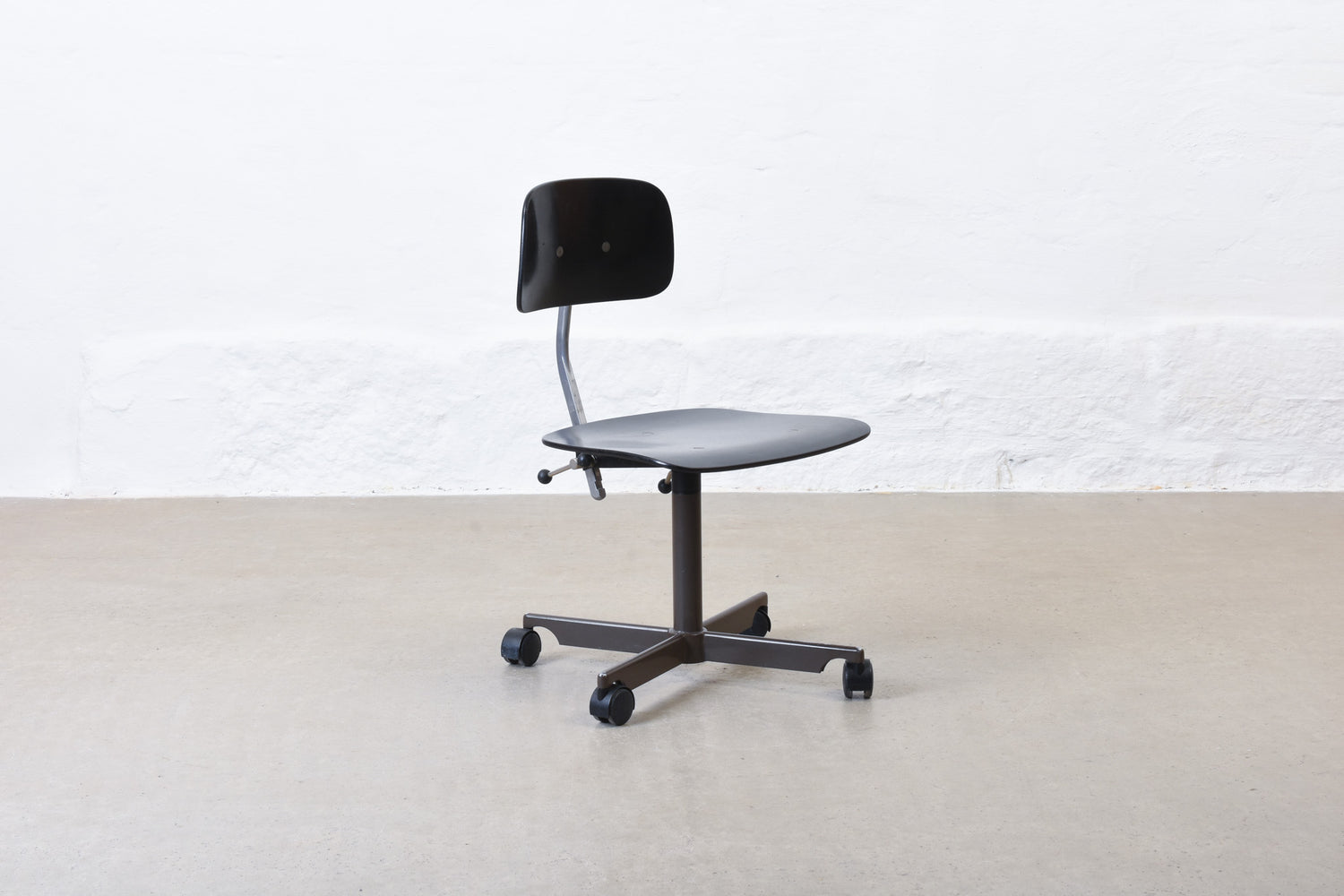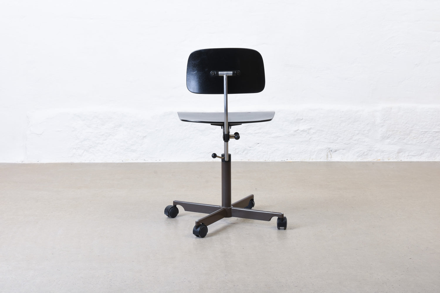 Task chair with a black-lacquered beech ply seat/back and metal base with its original plastic castors. The seat and backrest are height-adjustable.