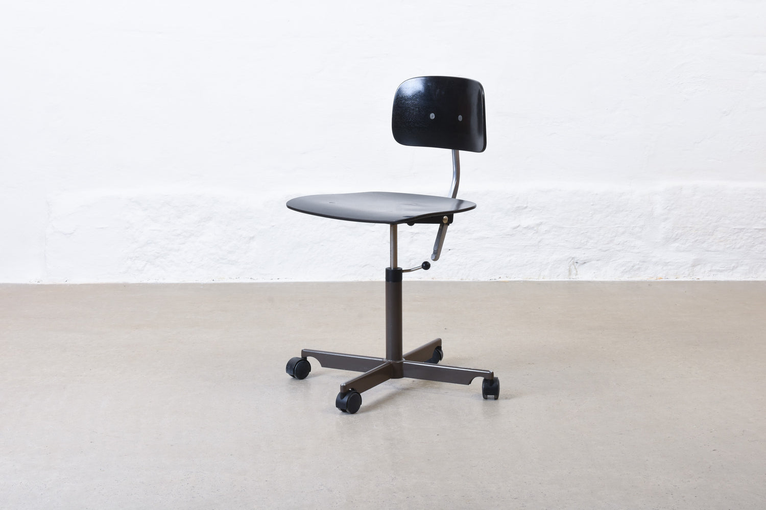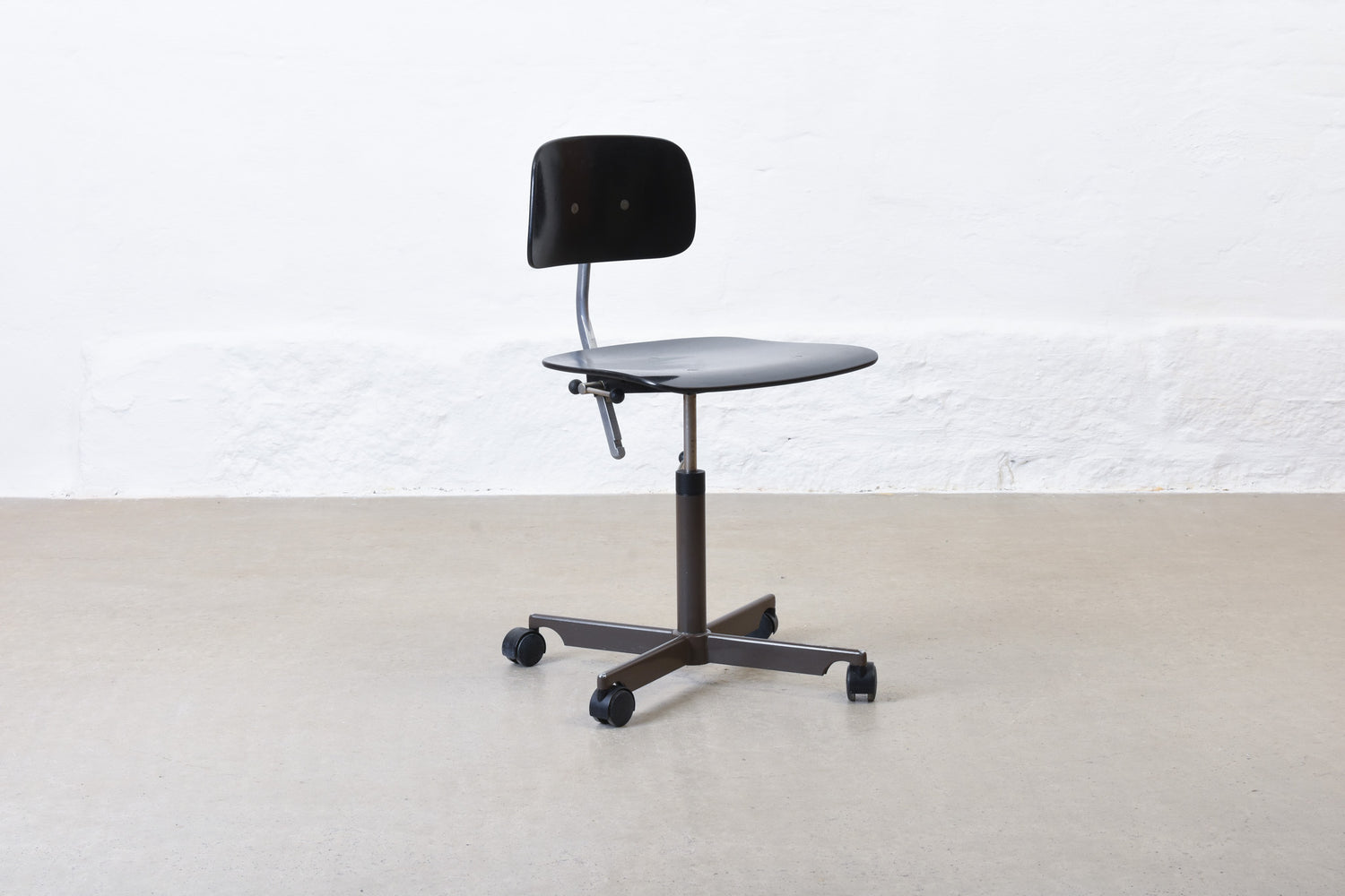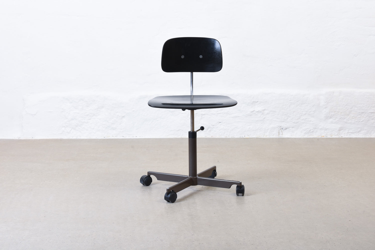 Task chair with a black-lacquered beech ply seat/back and metal base with its original plastic castors. The seat and backrest are height-adjustable.