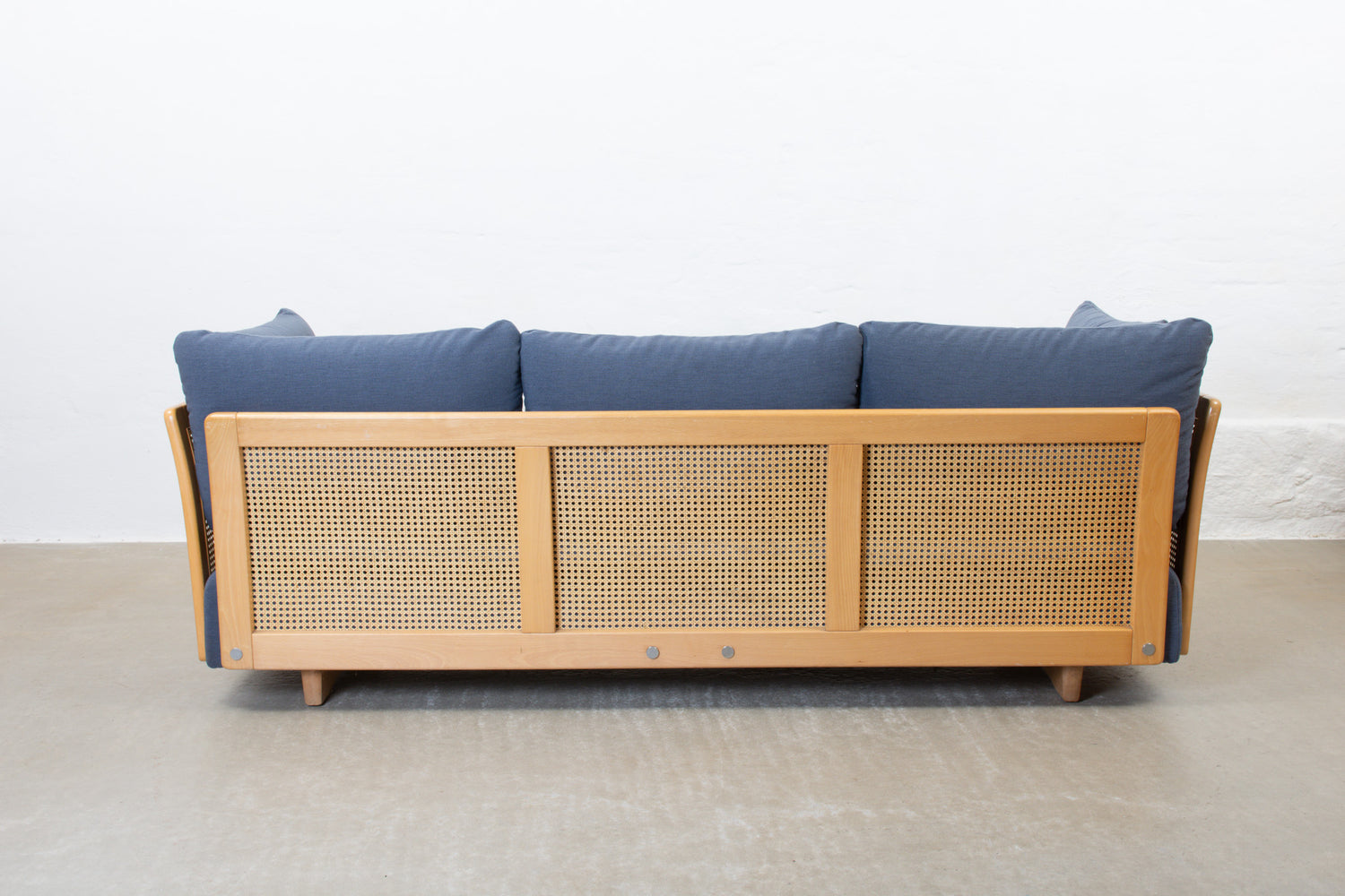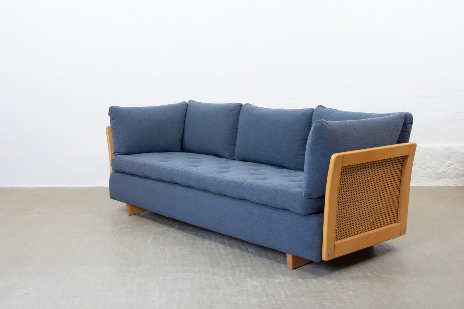 Vintage 'Milano' sofa bed with a beech and rattan frame, removable foam mattress and five loose cushions. Newly reupholstered in a cotton blend fabric.