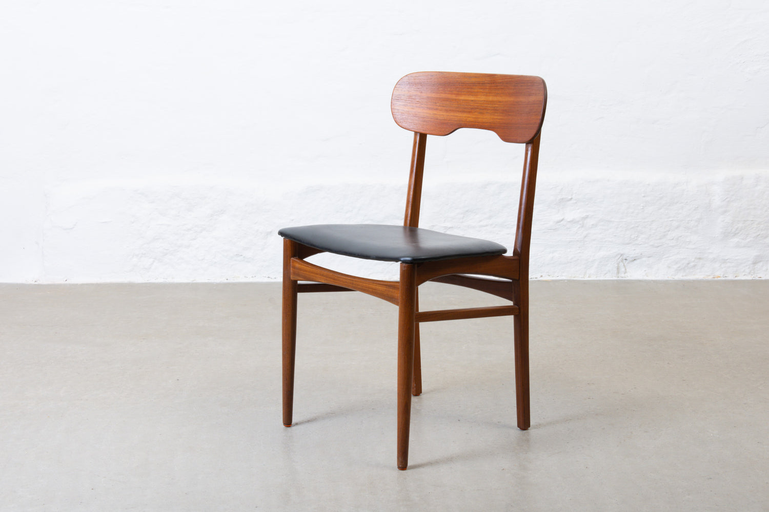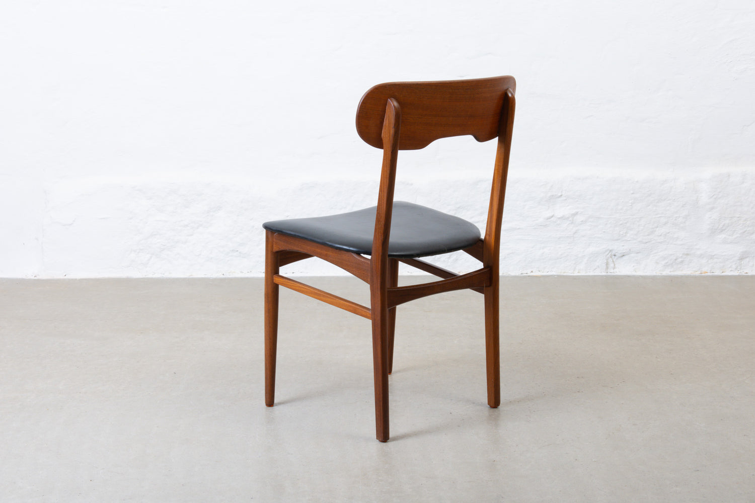Matching set of three chairs in teak with padded seats upholstered in their original vinyl fabric.