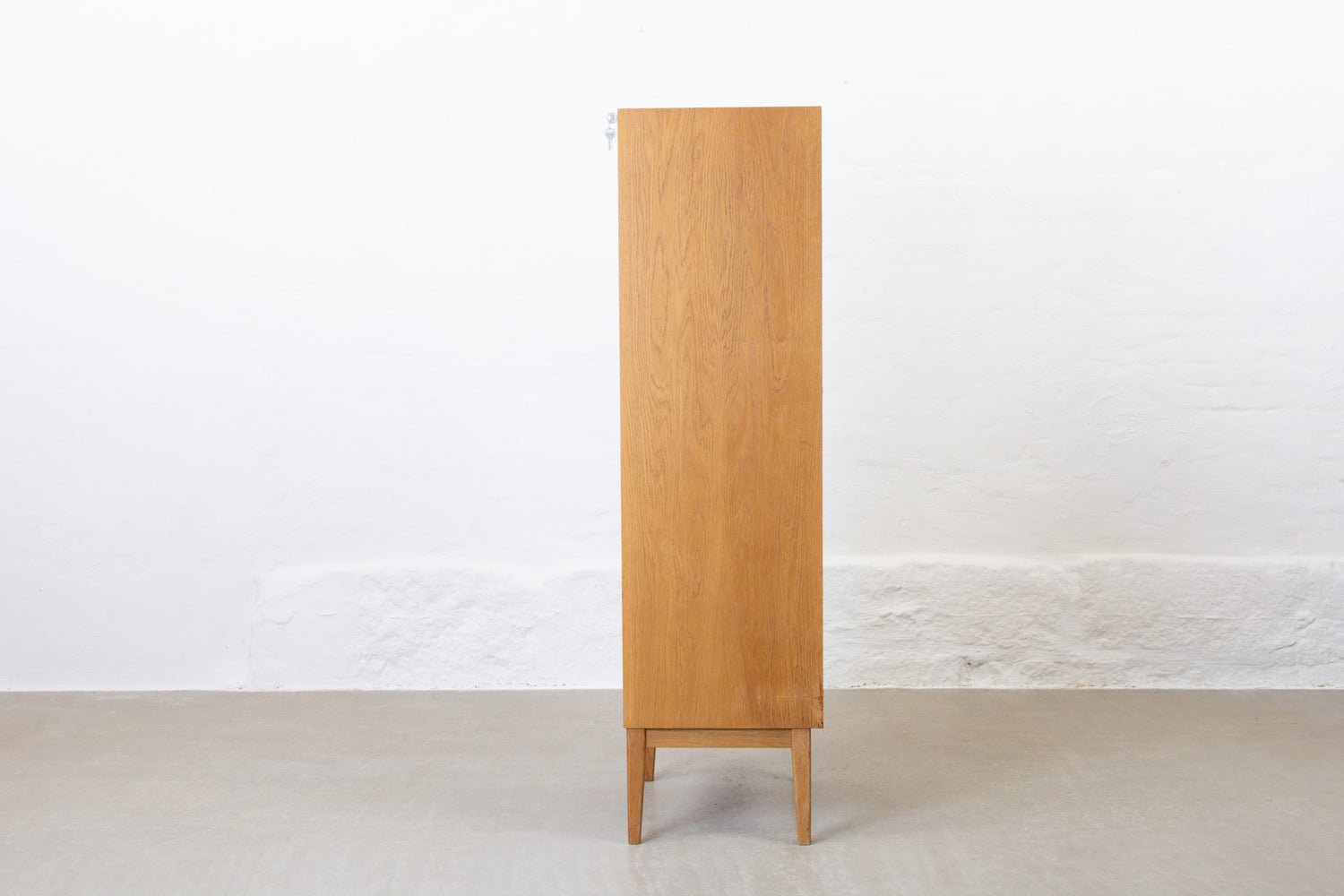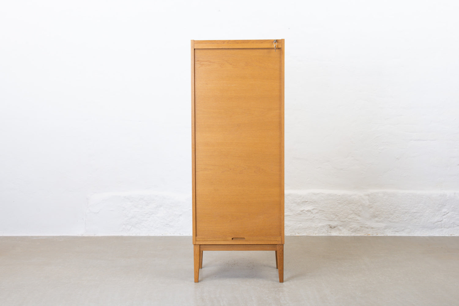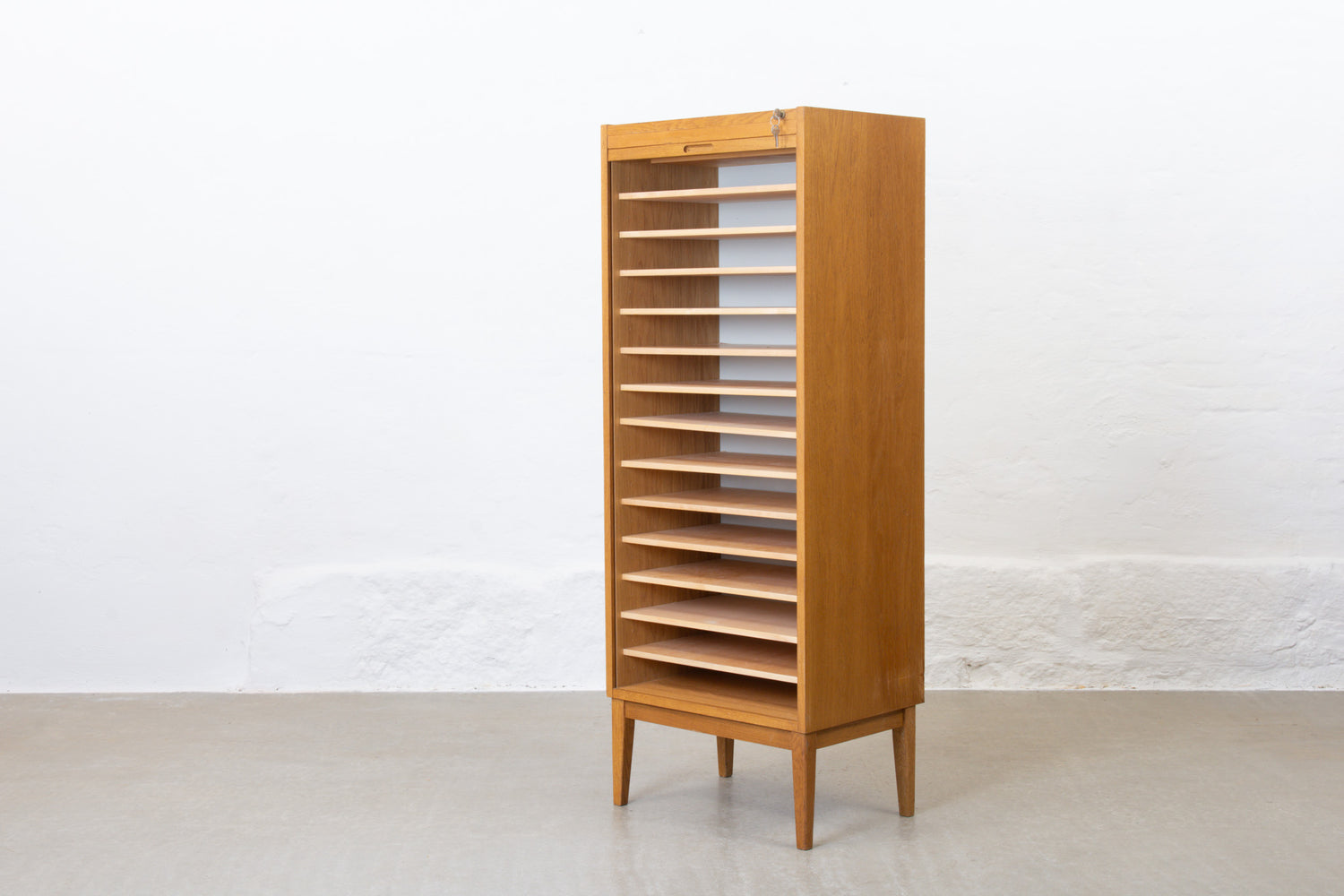 Tall archive cabinet in oak with locking tambour door and 13 adjustable shelves. Includes two keys.