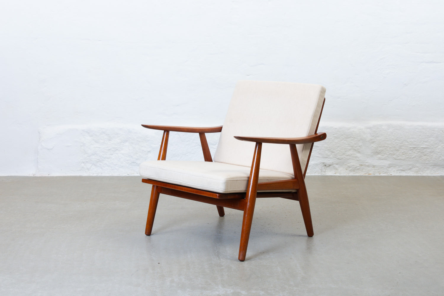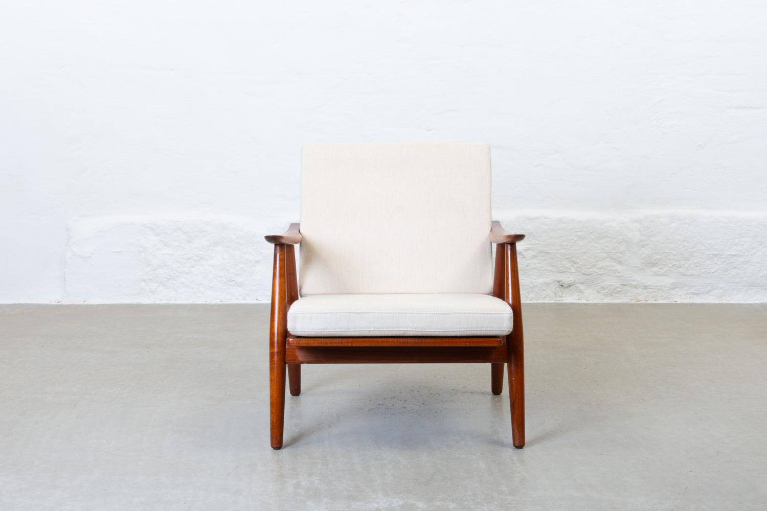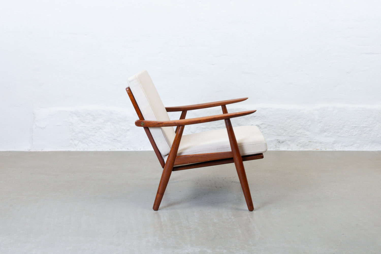 Low back 'GE-270' lounge chair in solid teak with brass details. Features two loose foam cushions upholstered in their original cream wool.