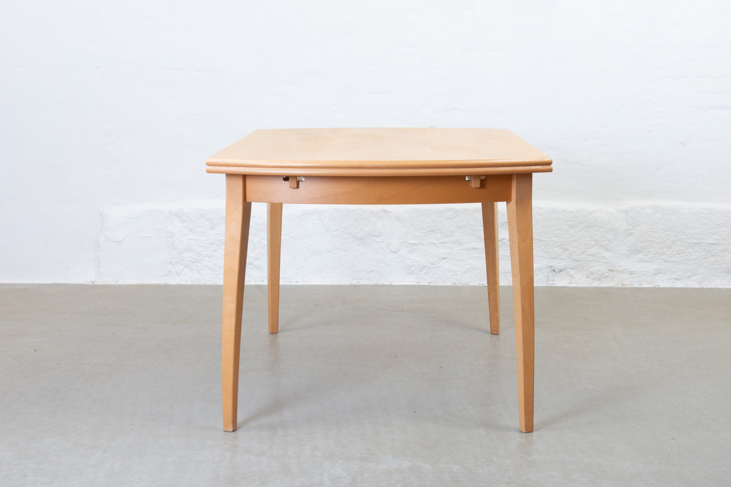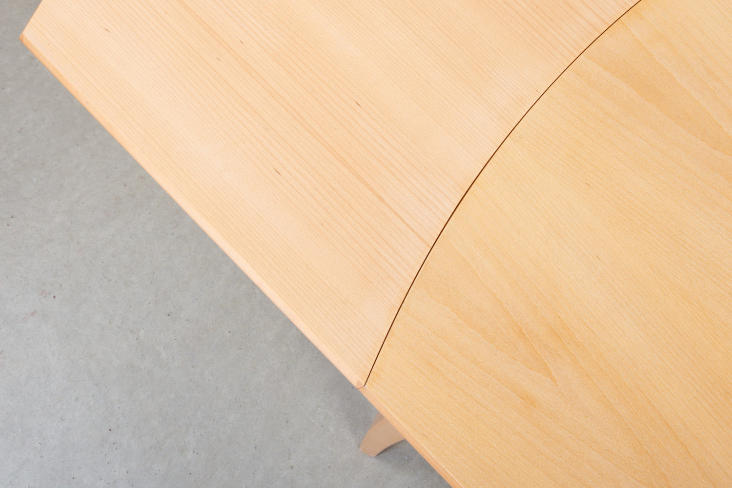 Extending dining table in beech on curved legs. Sits six normally and up to ten comfortably when fully extended.