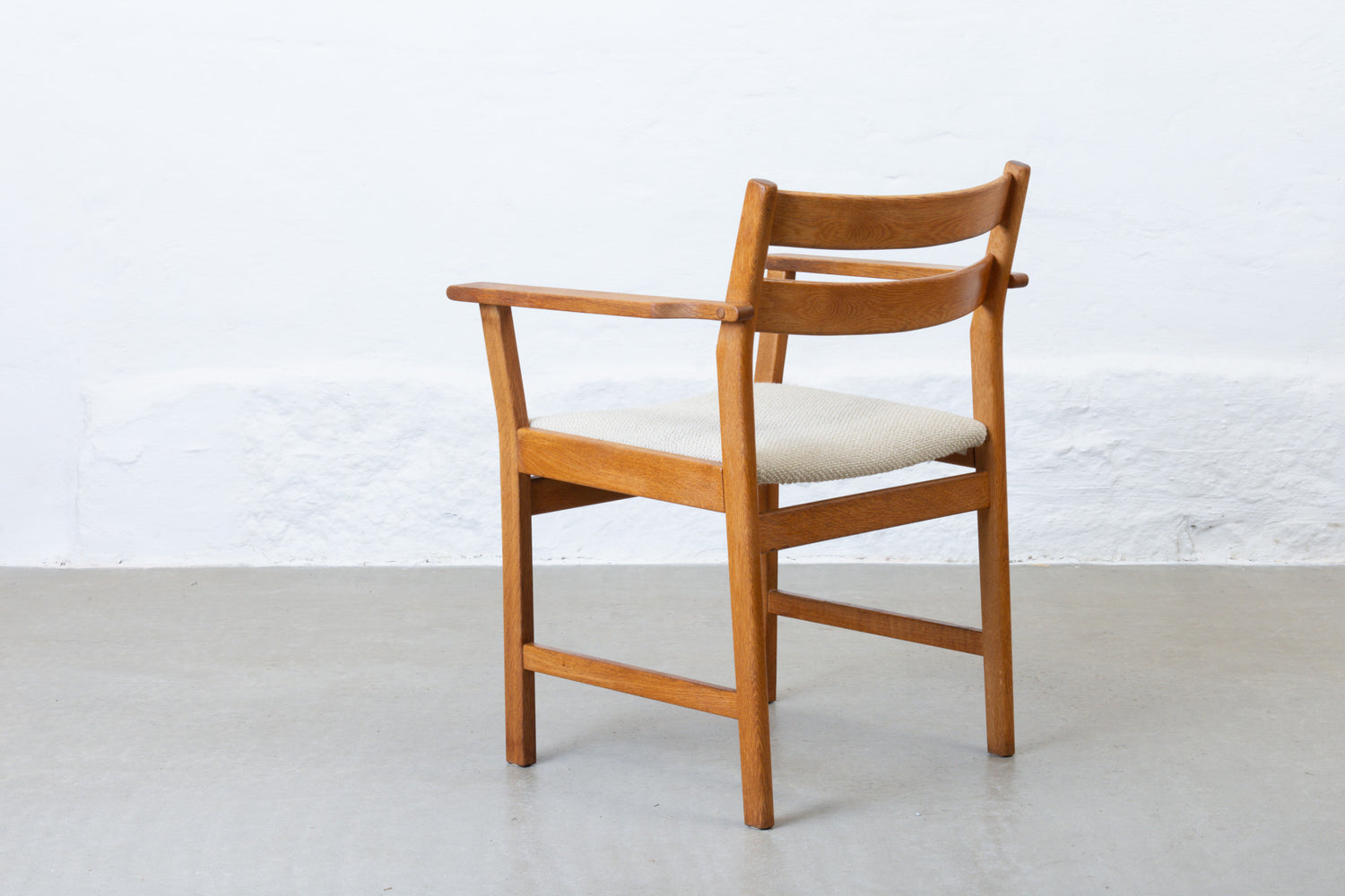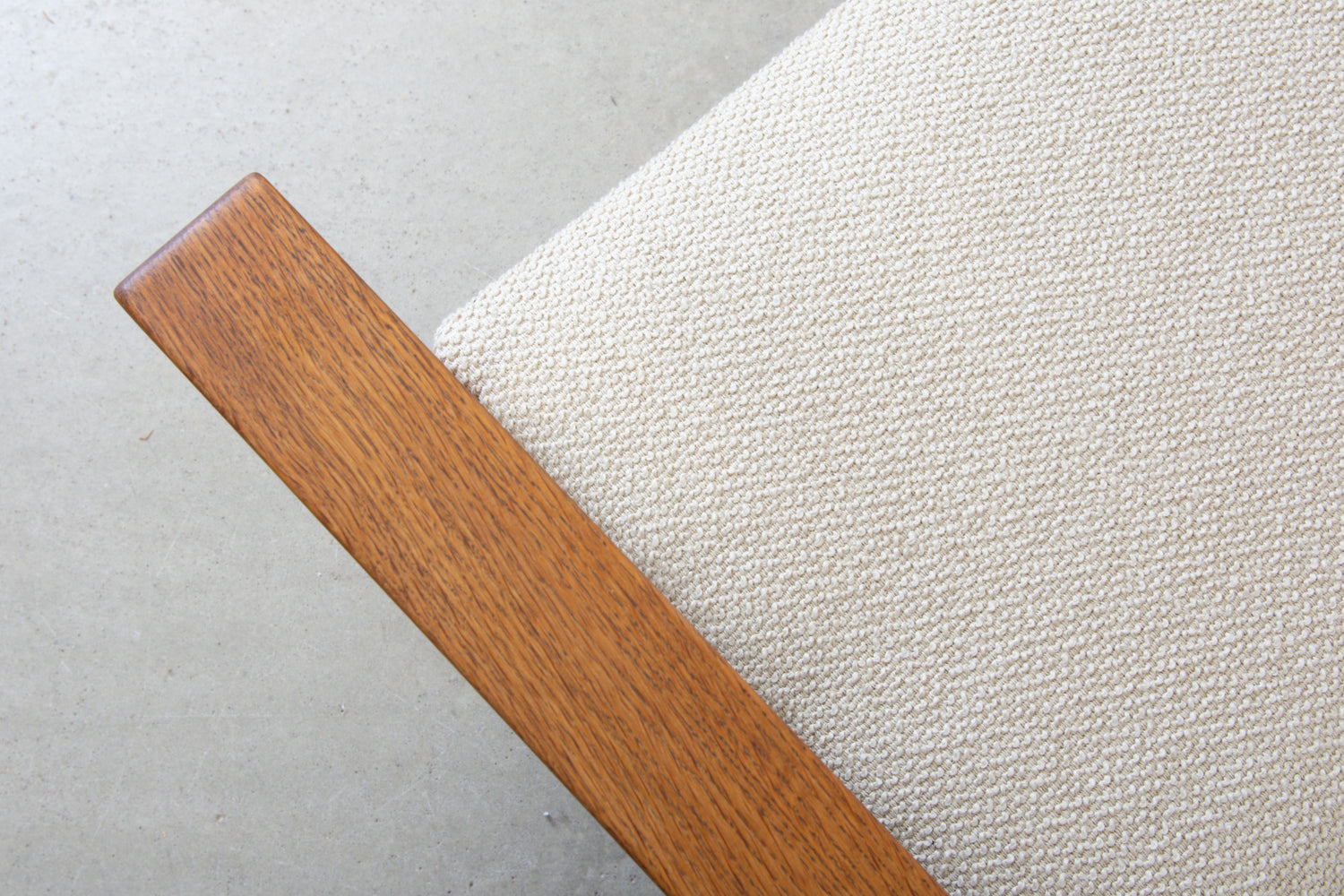 Armchair with an oiled oak frame and padded seat newly reupholstered in a textured cotton/wool blend by Yarn Collective.