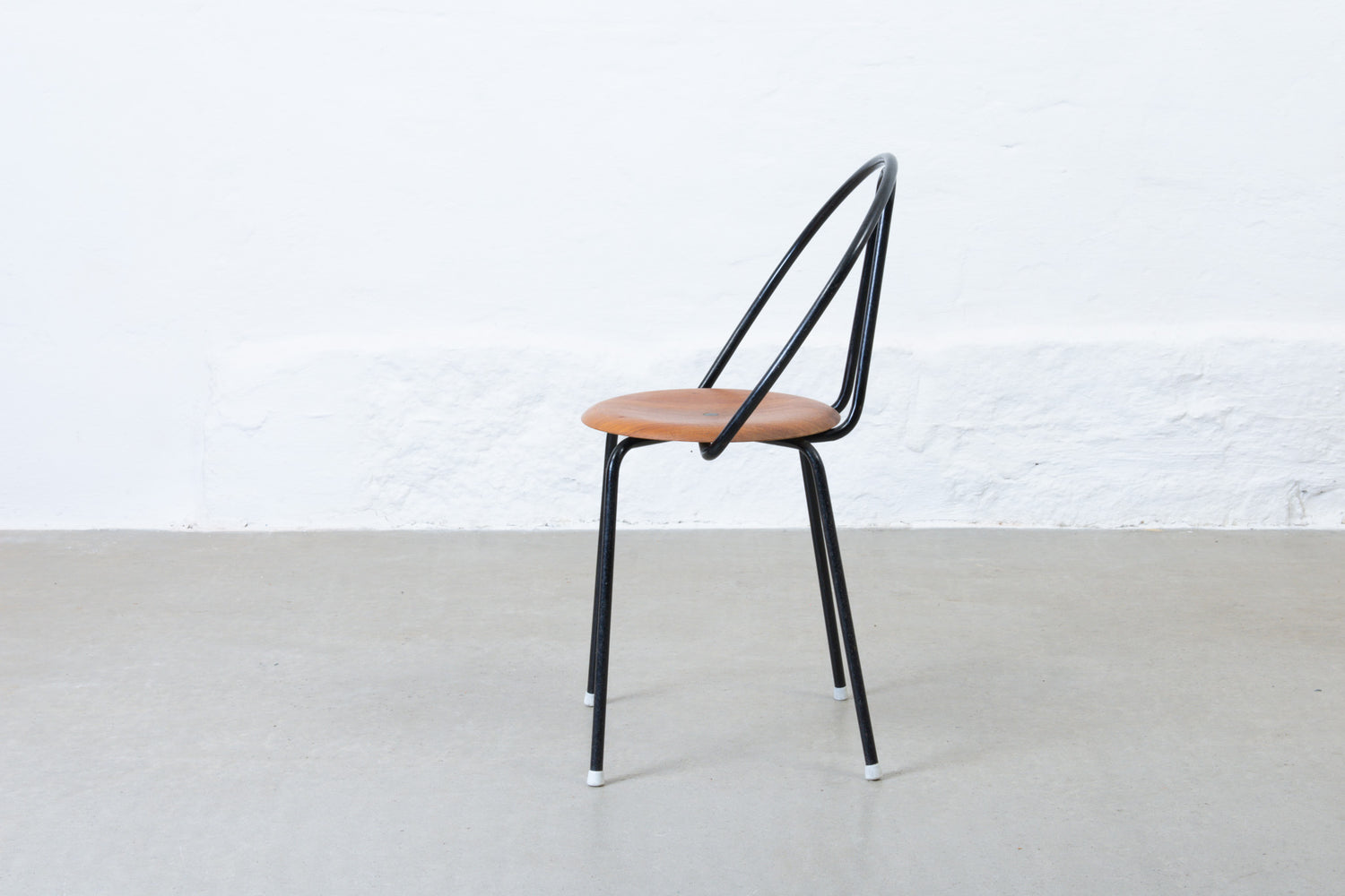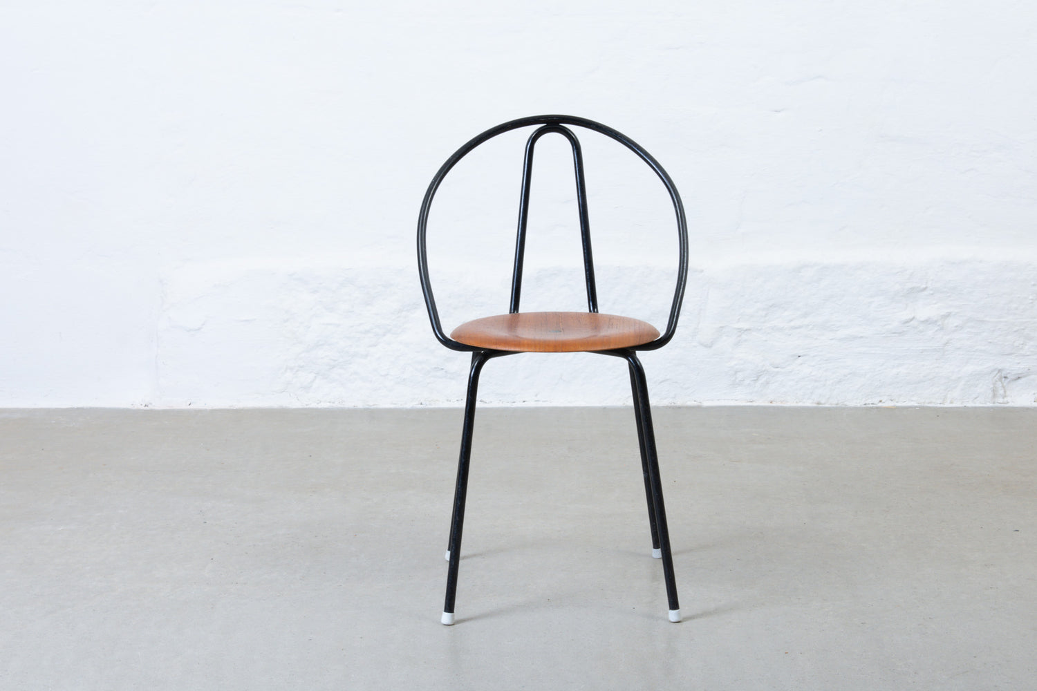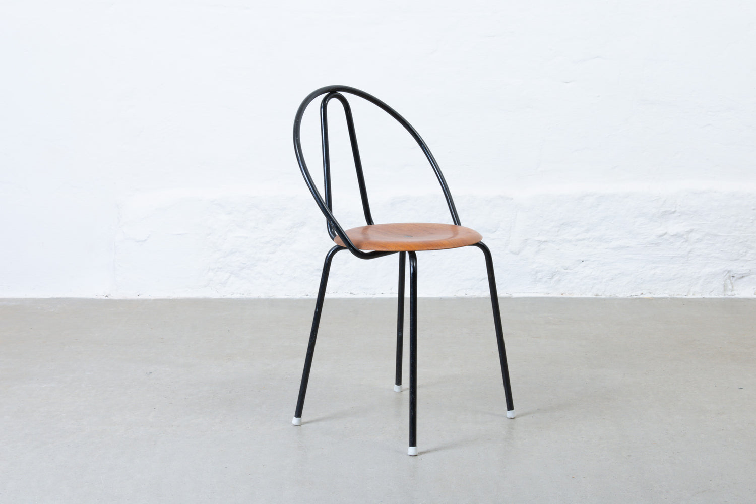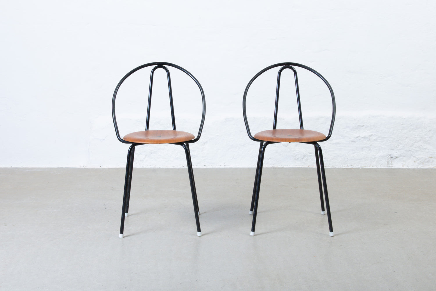 Matching pair of stacking chairs with metal frames and moulded teak ply seats.