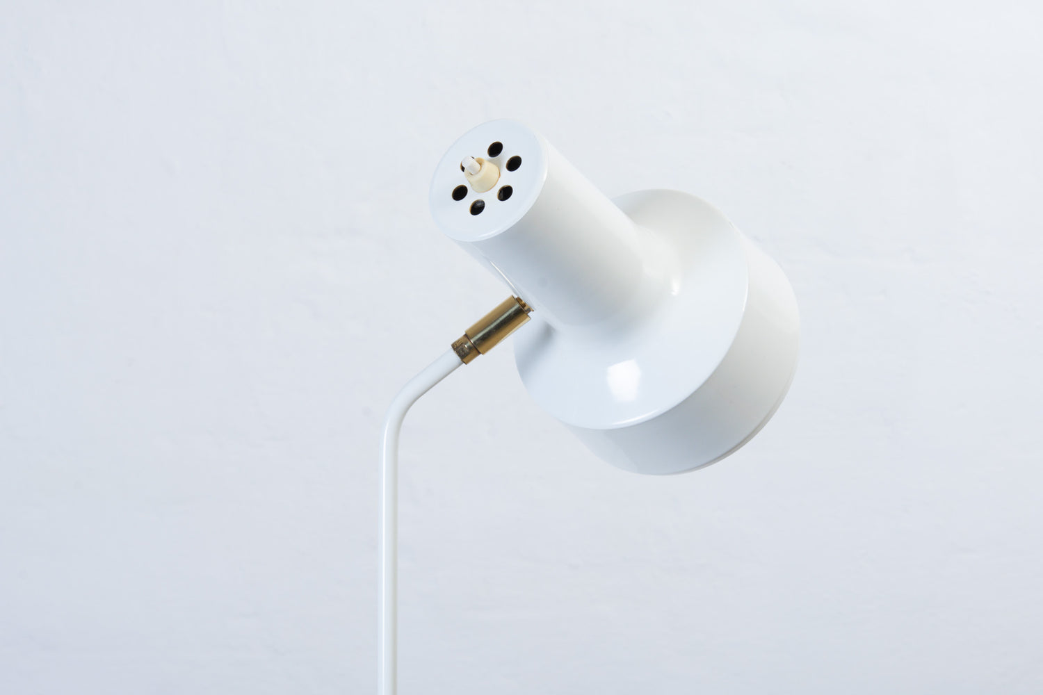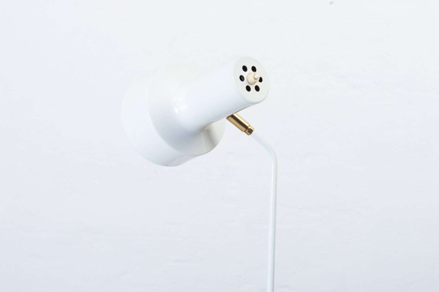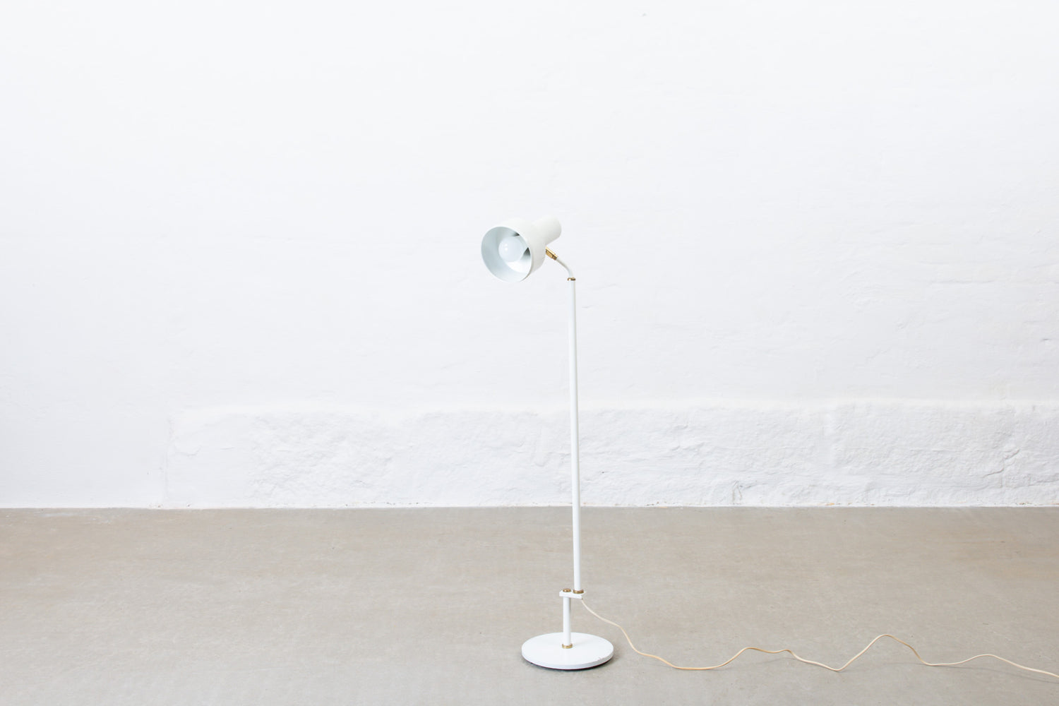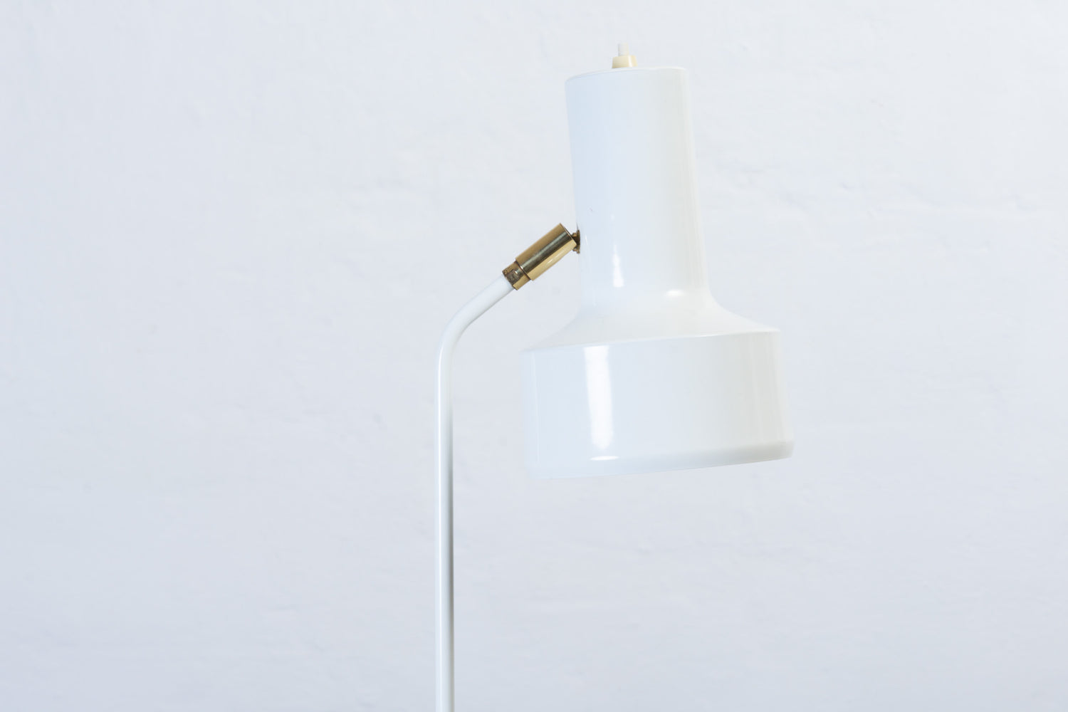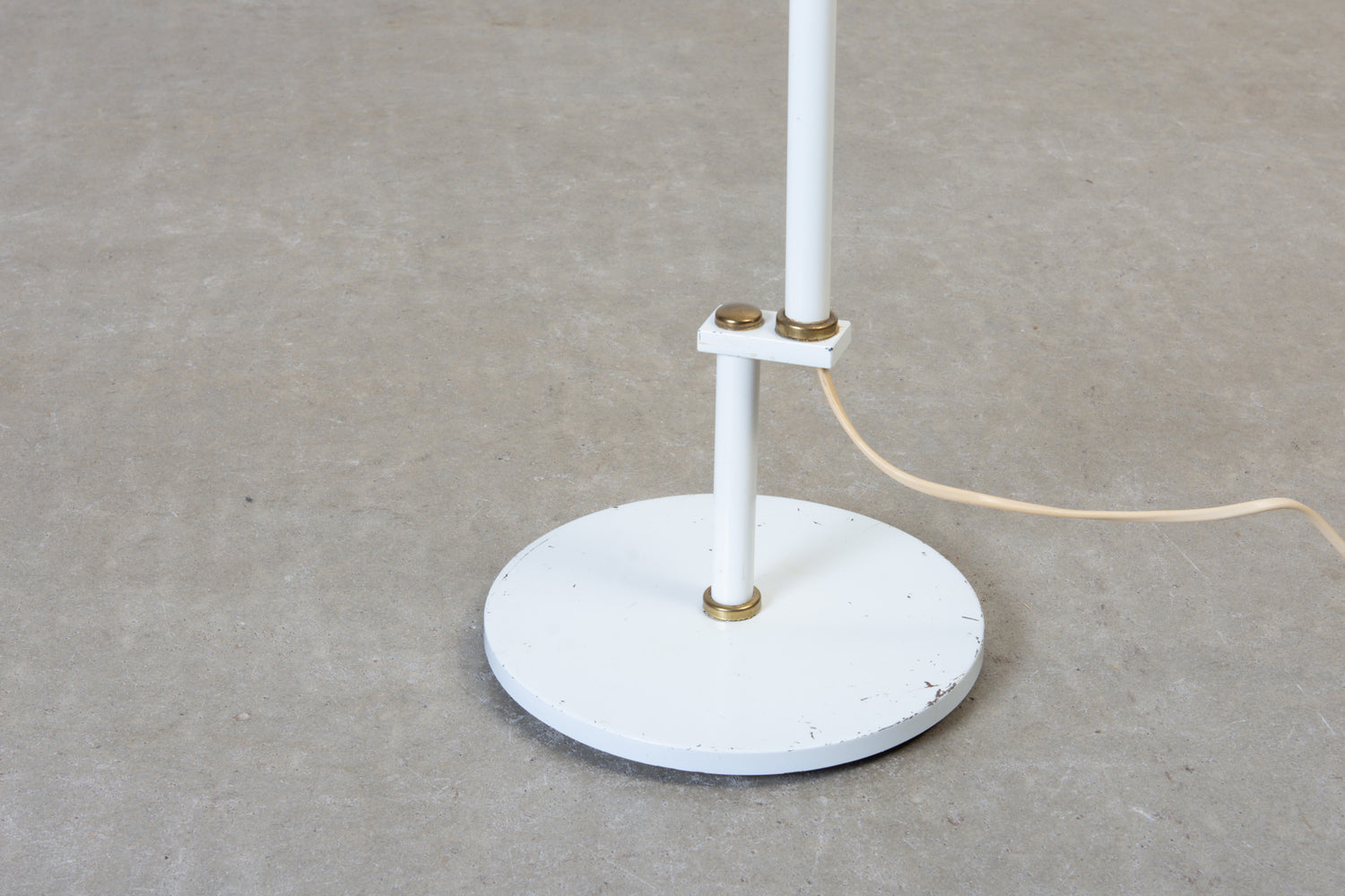 Height-adjustable floor lamp in white lacquered metal with brass details.
