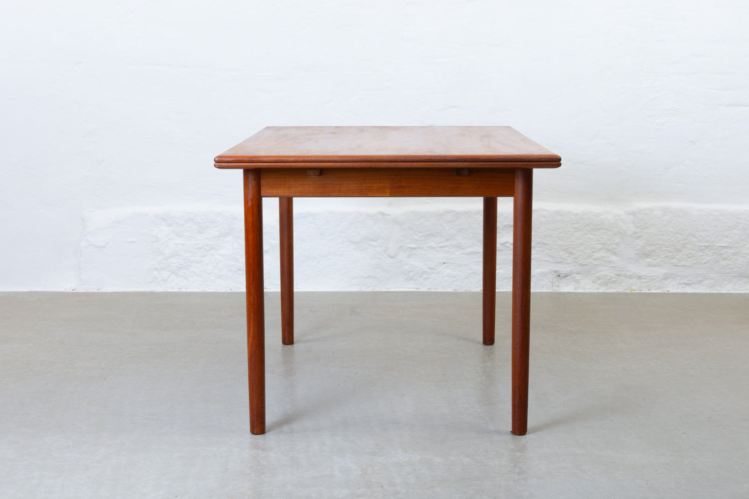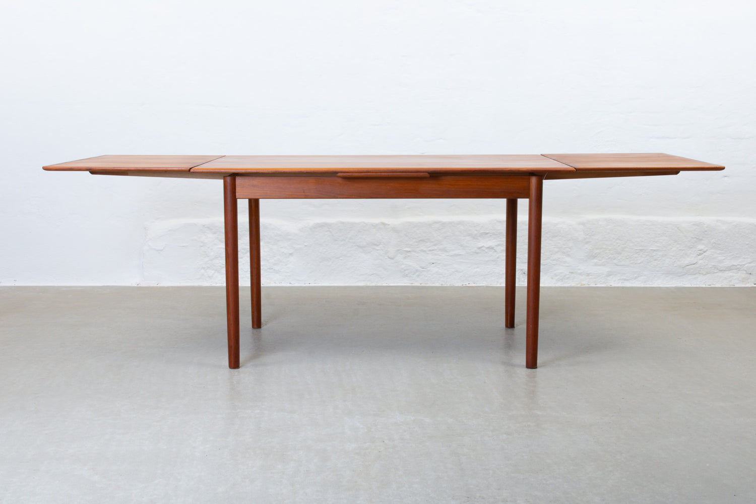 Extending dining table in teak with two hidden pull-out extension leaves. Sits six normally and up to eight comfortably when fully extended.