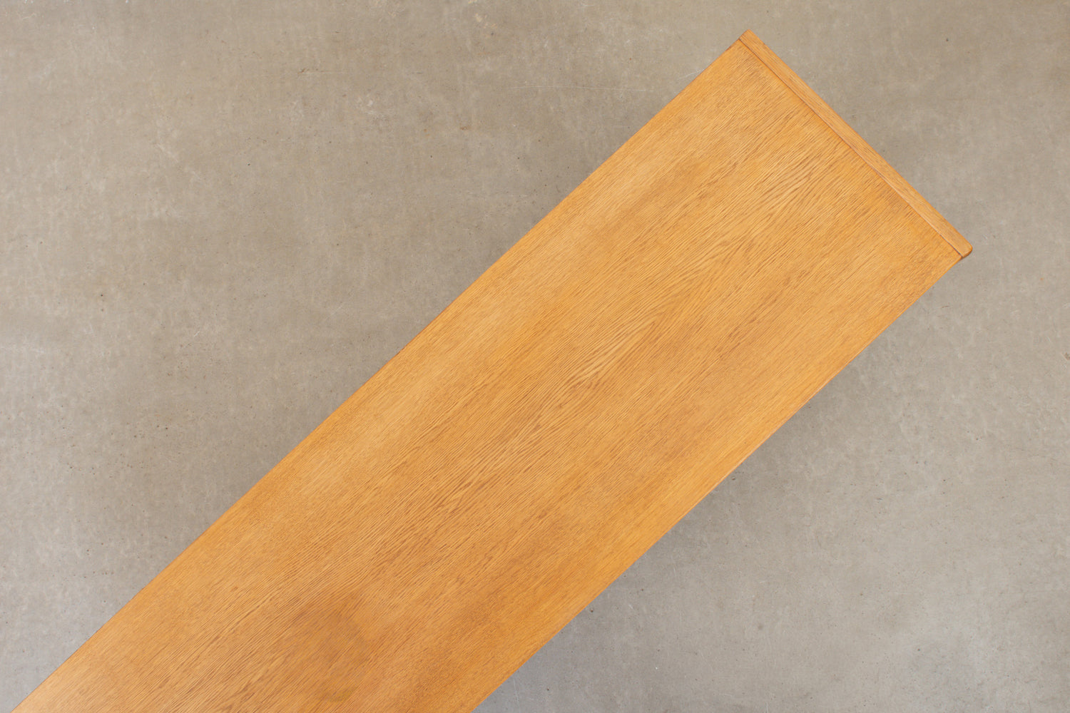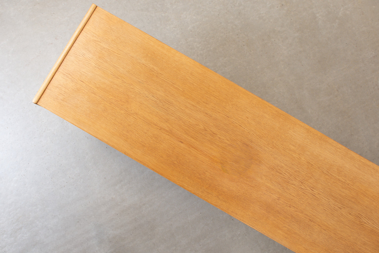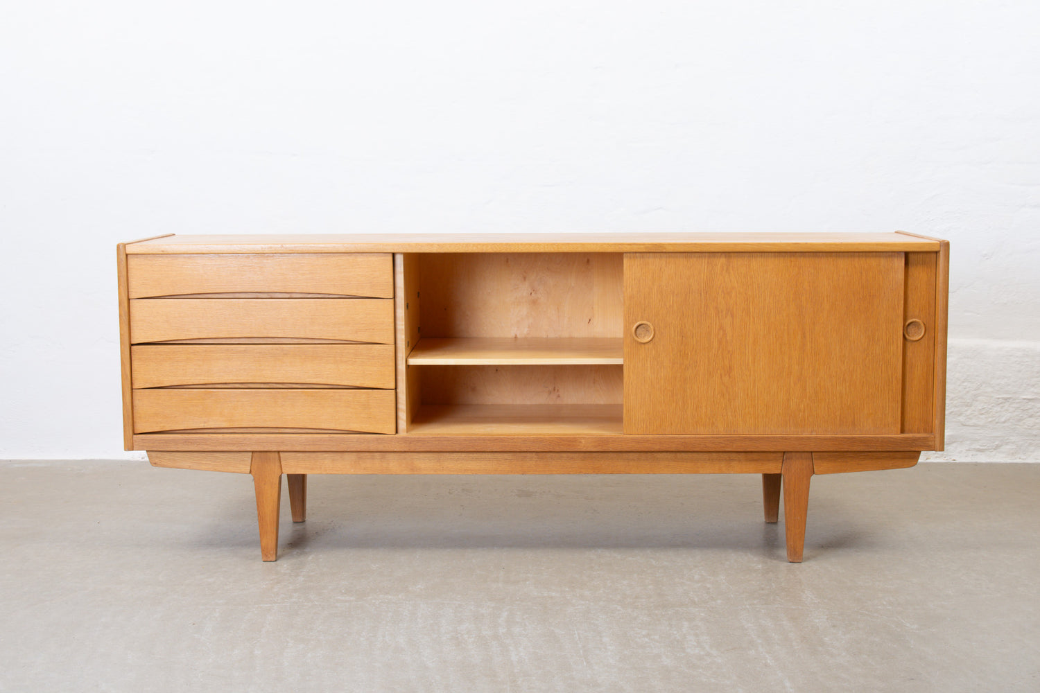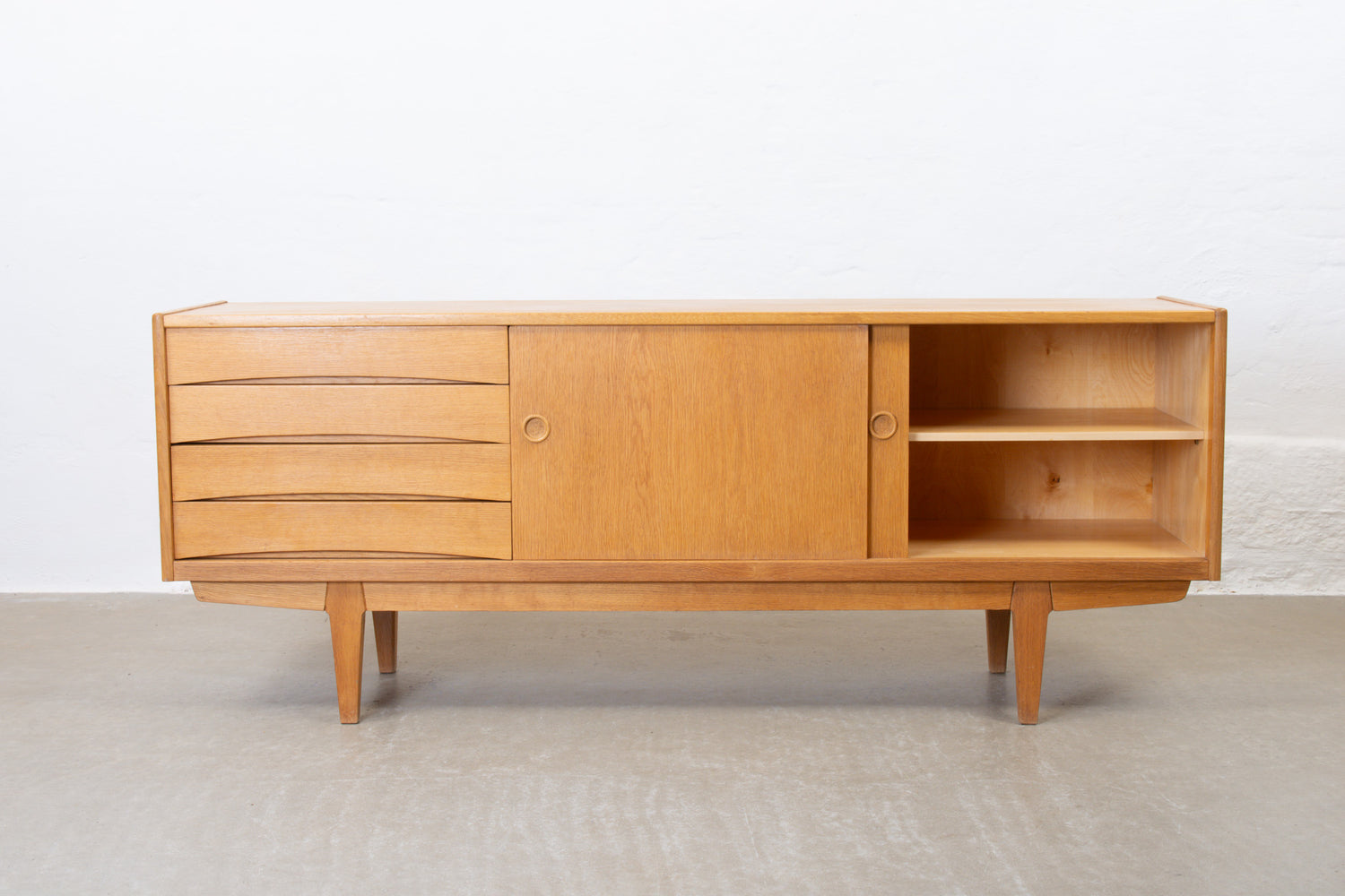 Long 'Ulvö' sideboard in oak with sliding doors, adjustable internal shelving and four drawers.