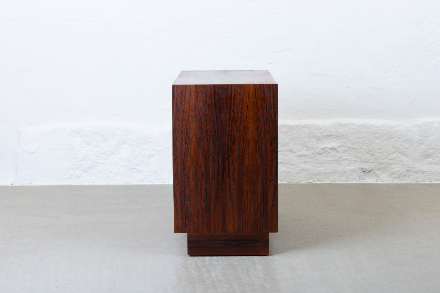 Short sideboard in rosewood with sliding doors and one internal shelf. Sits on a plinth base.