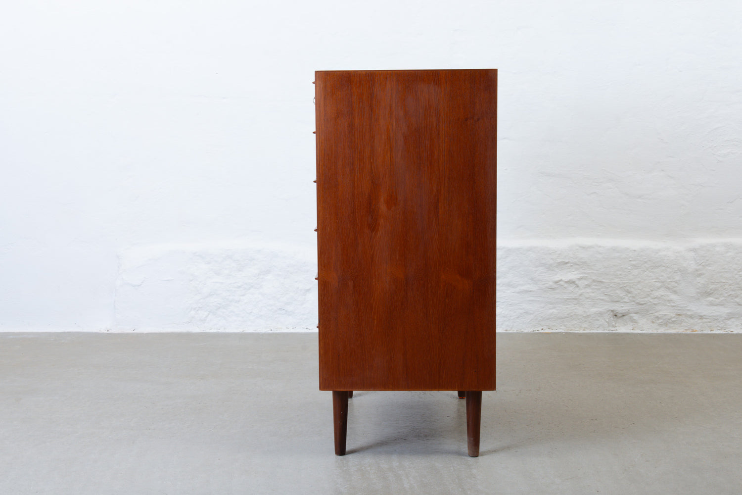 Chest of six drawers in teak with lipped handles. Features locking top drawer and sits on tapered teak legs.