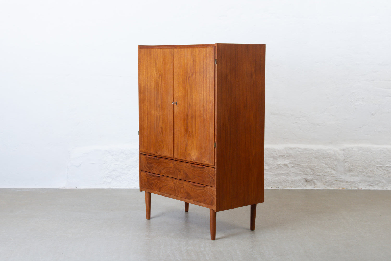 Storage cabinet in teak with locking cupboard, internal shelving and two low drawers. Sits on tapered solid teak legs.