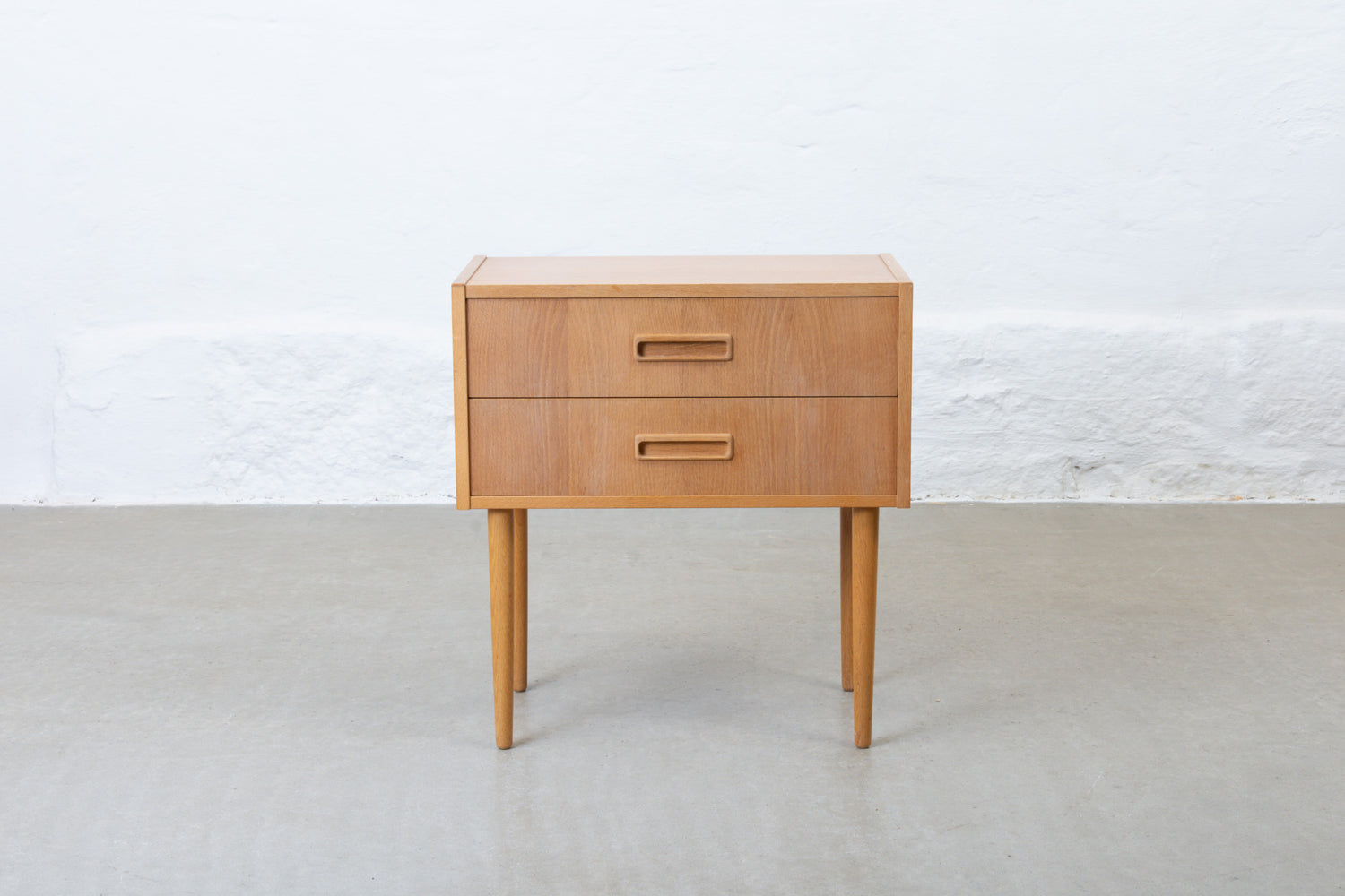 Low chest of two drawers in oak on turned legs. Well suited for use in a hallway beneath a mirror or as a bedside table.