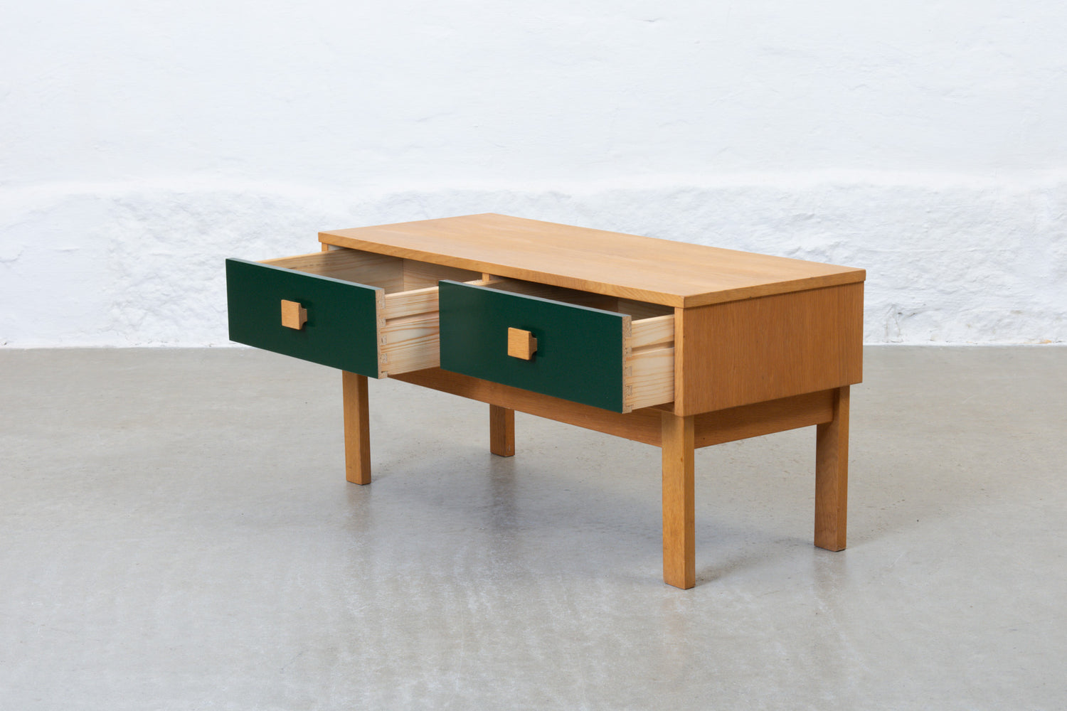 Low chest of two drawers in oak with lacquered fronts.