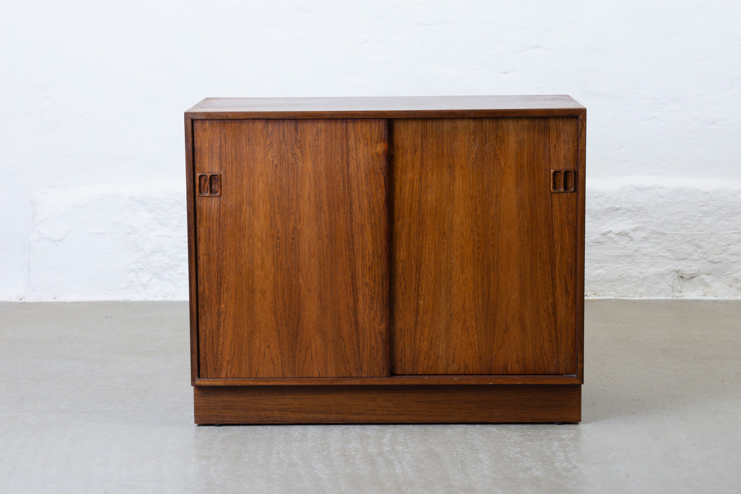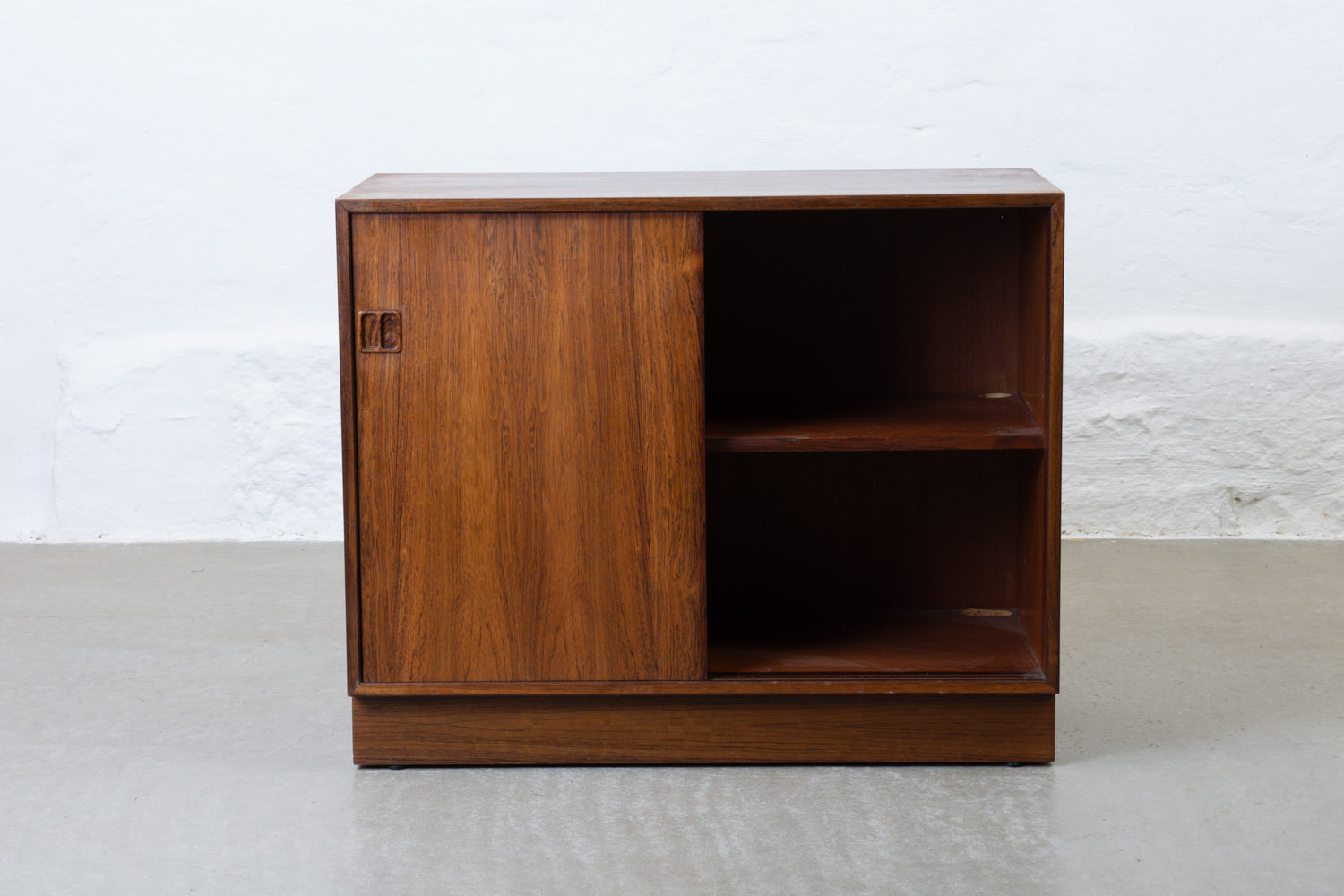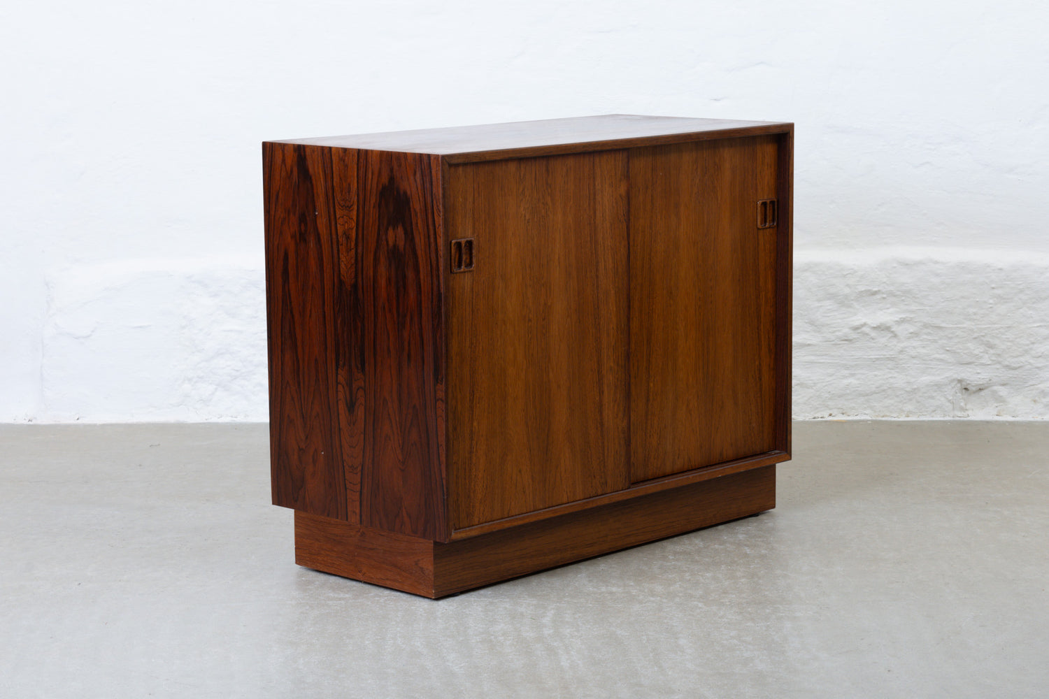 Short sideboard in rosewood with sliding doors and one internal shelf. Sits on a plinth base.