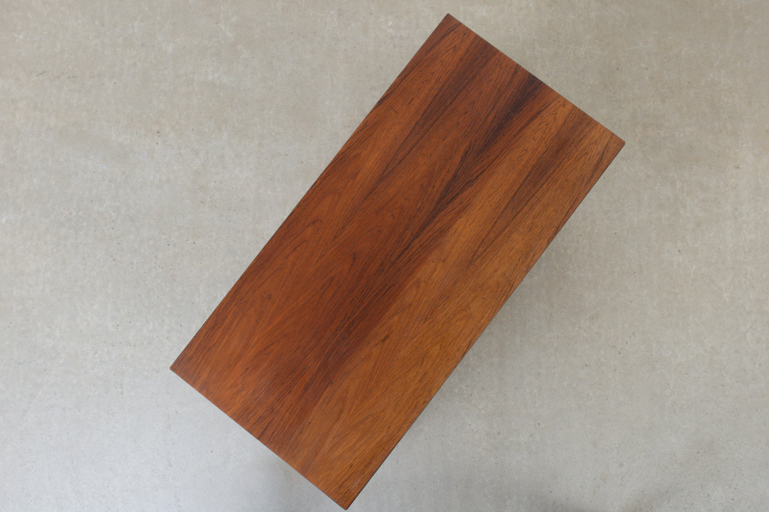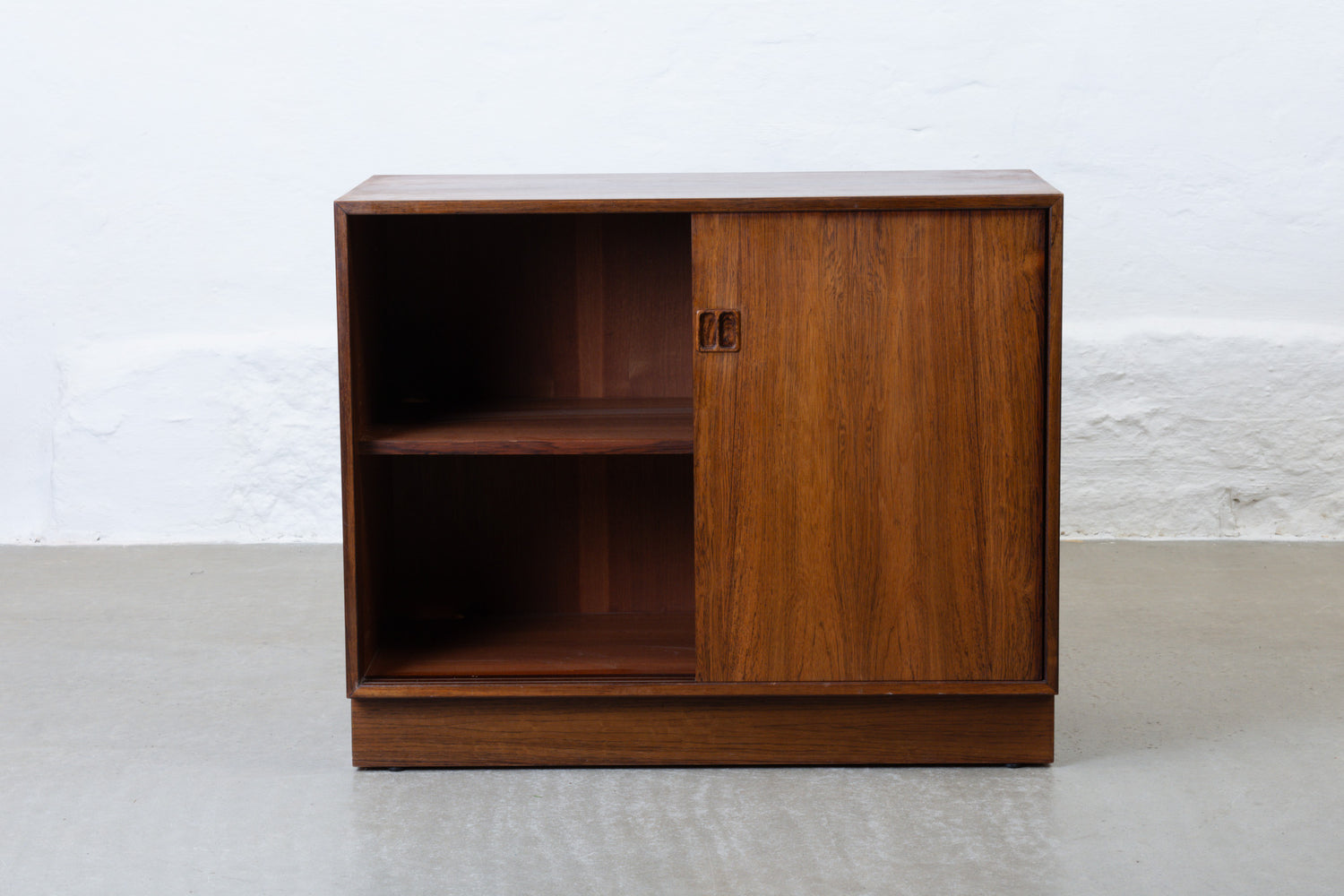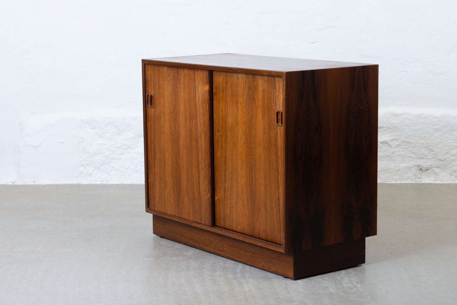 Short sideboard in rosewood with sliding doors and one internal shelf. Sits on a plinth base.