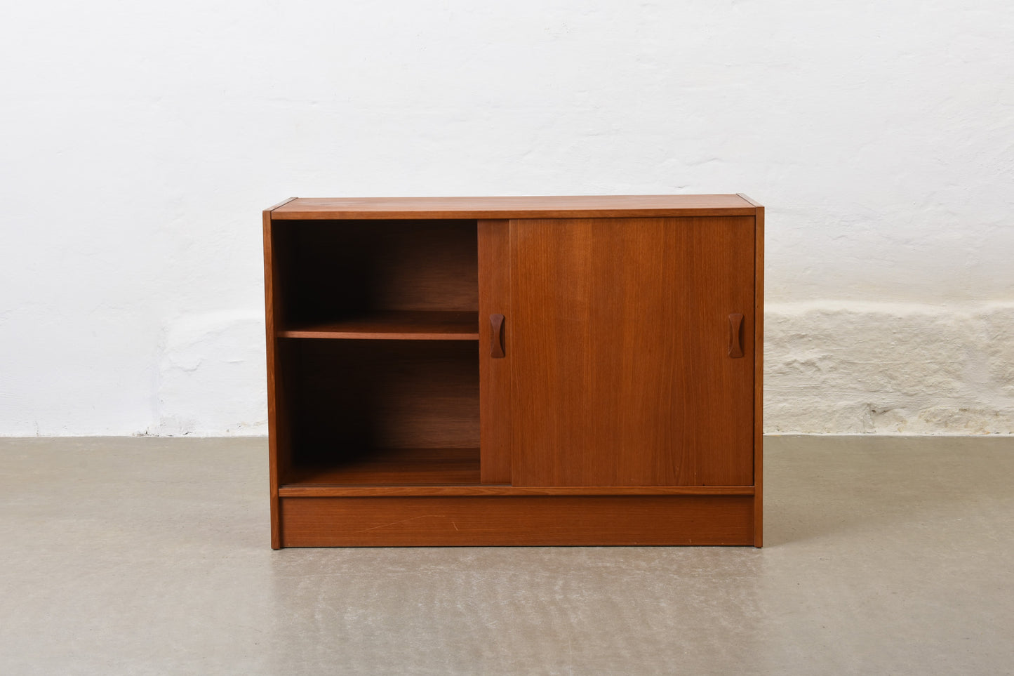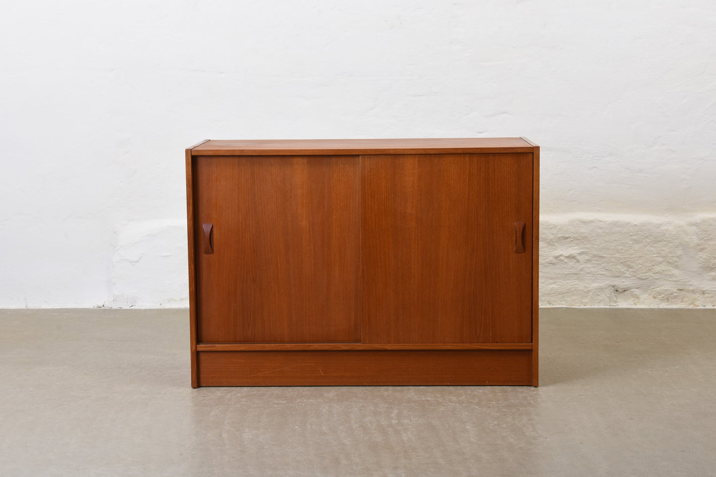 Short sideboard on plinth base in teak with sliding doors and one internal shelf.