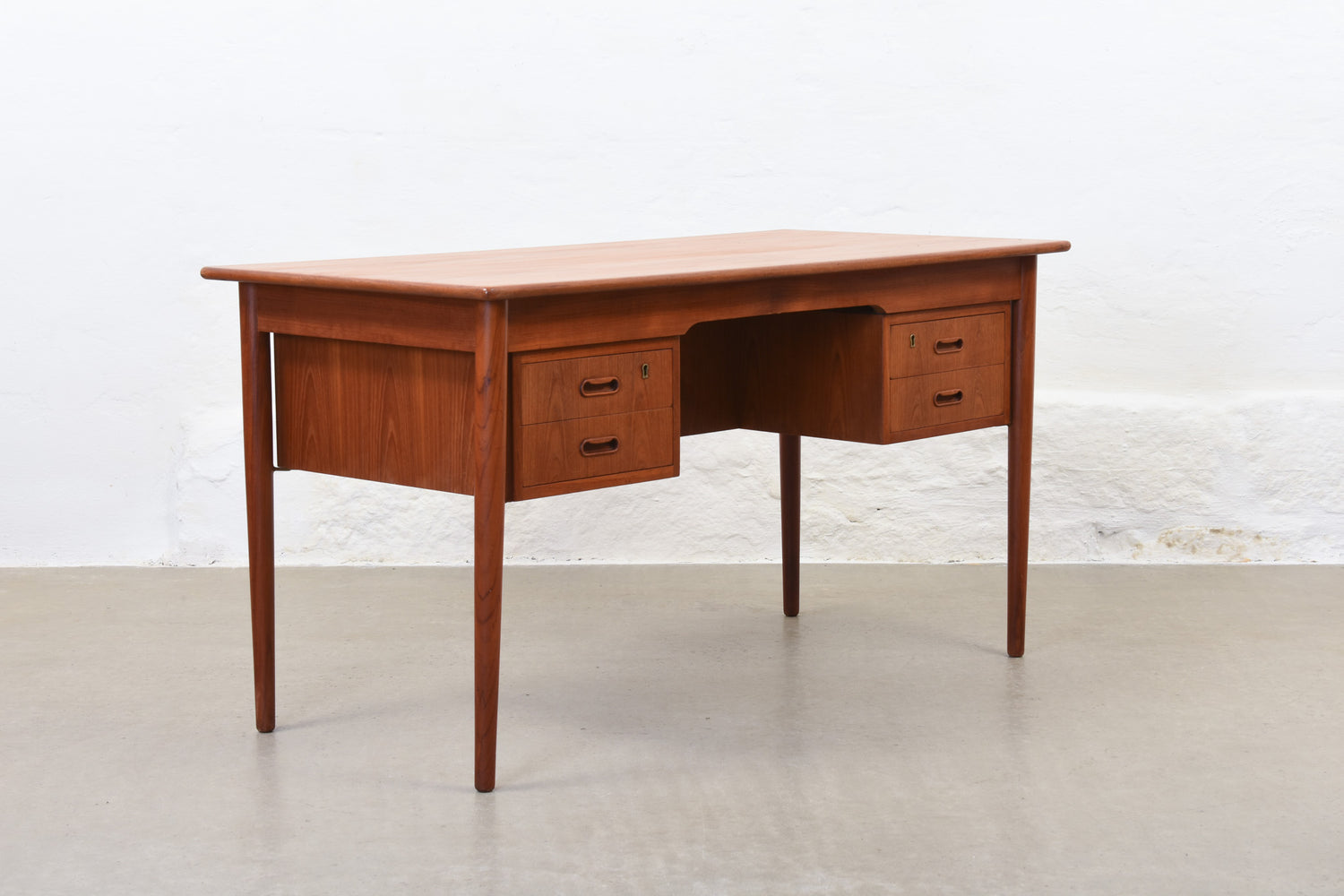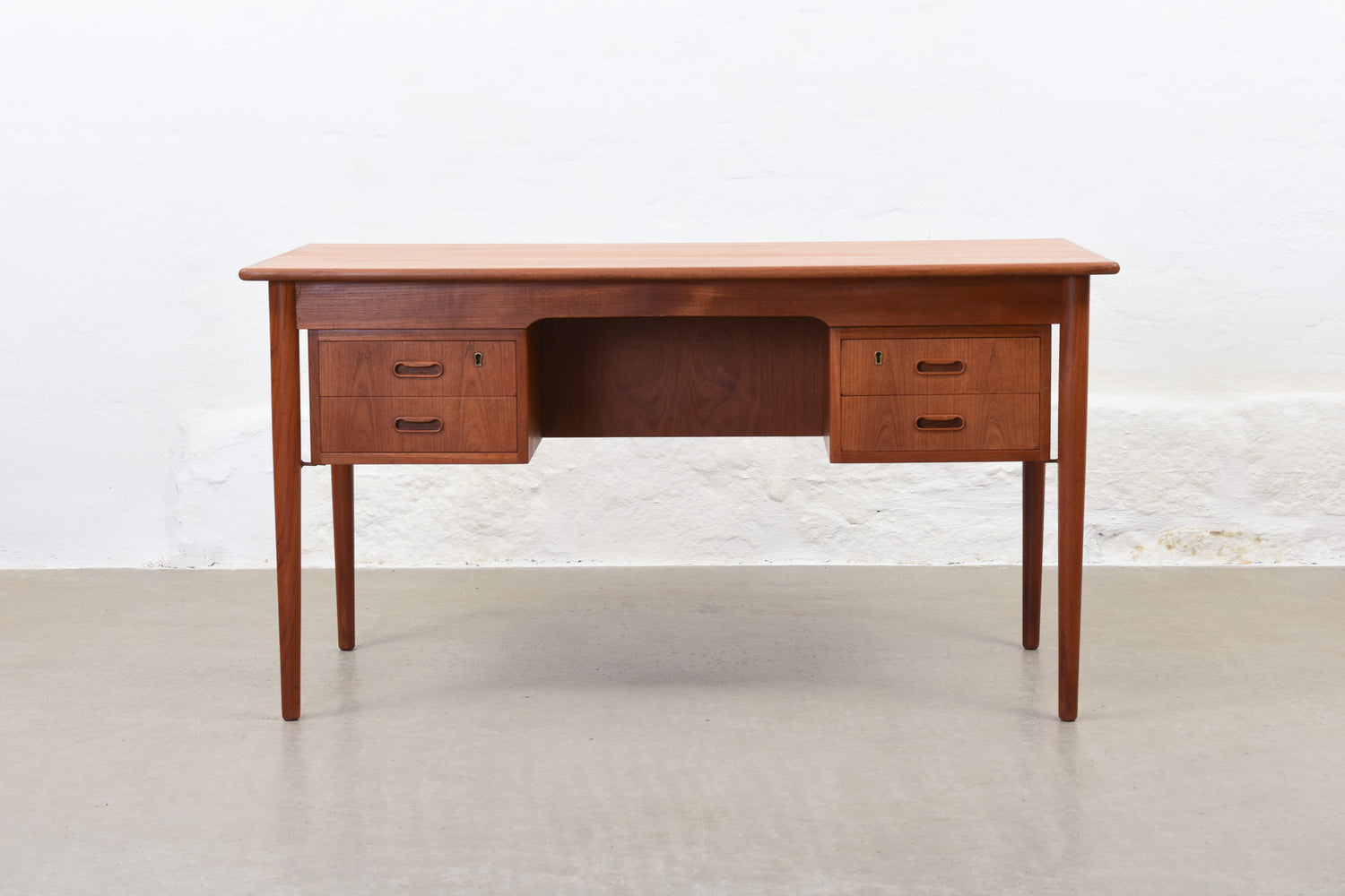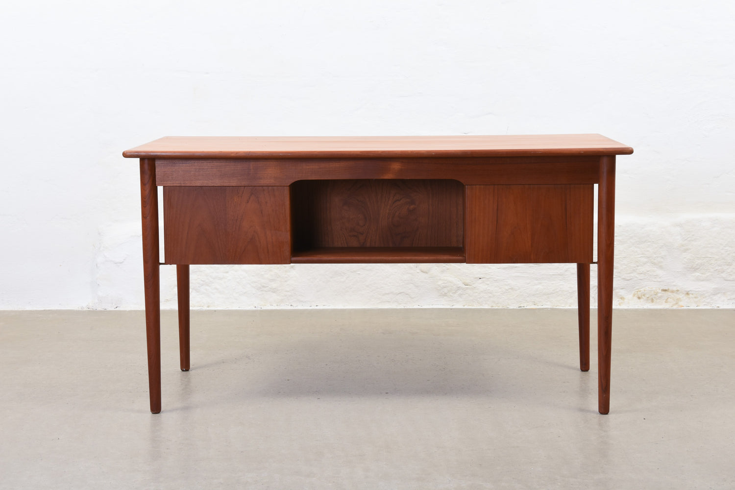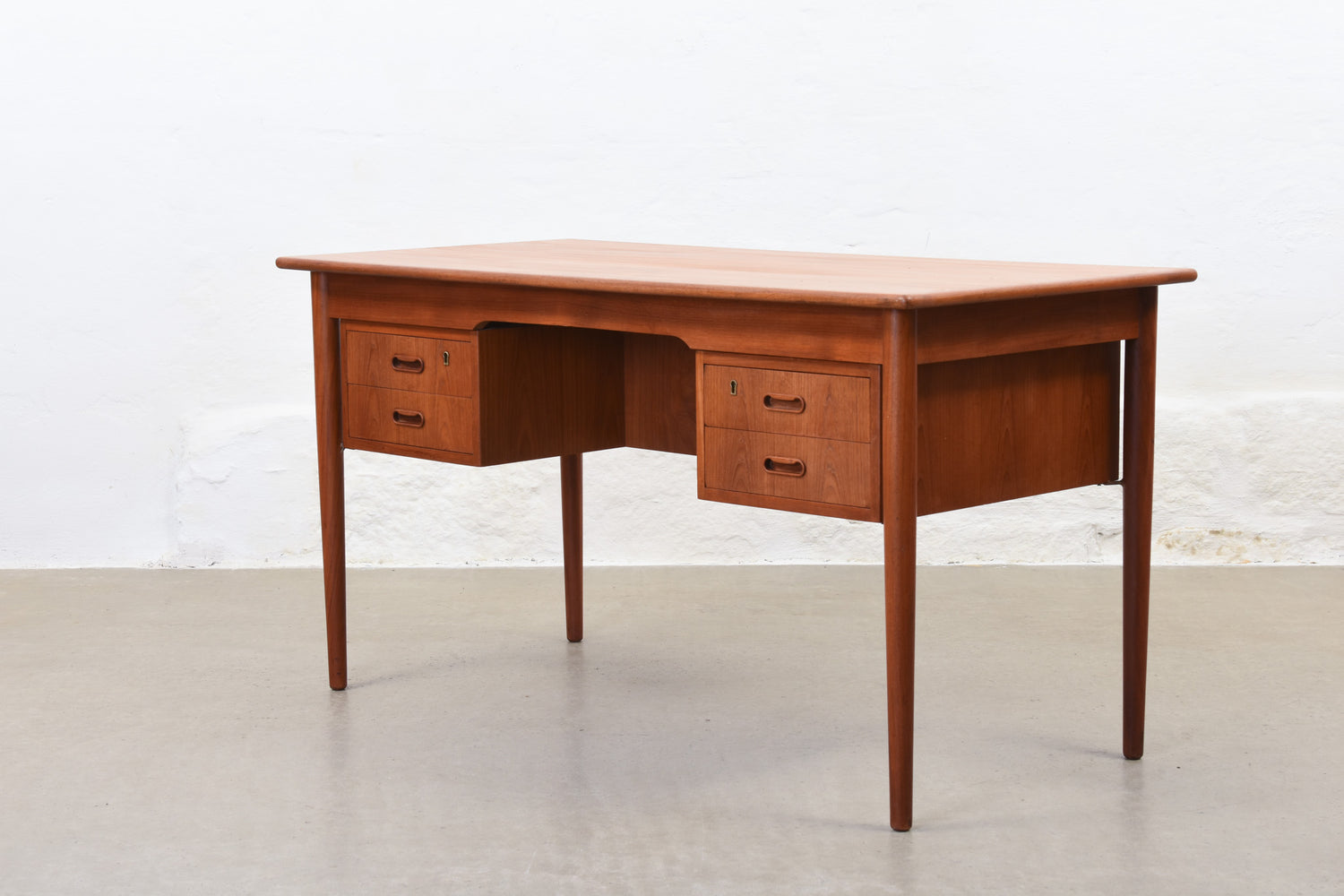 Twin pedestal desk in teak with a selection of four drawers and rear bookshelf.